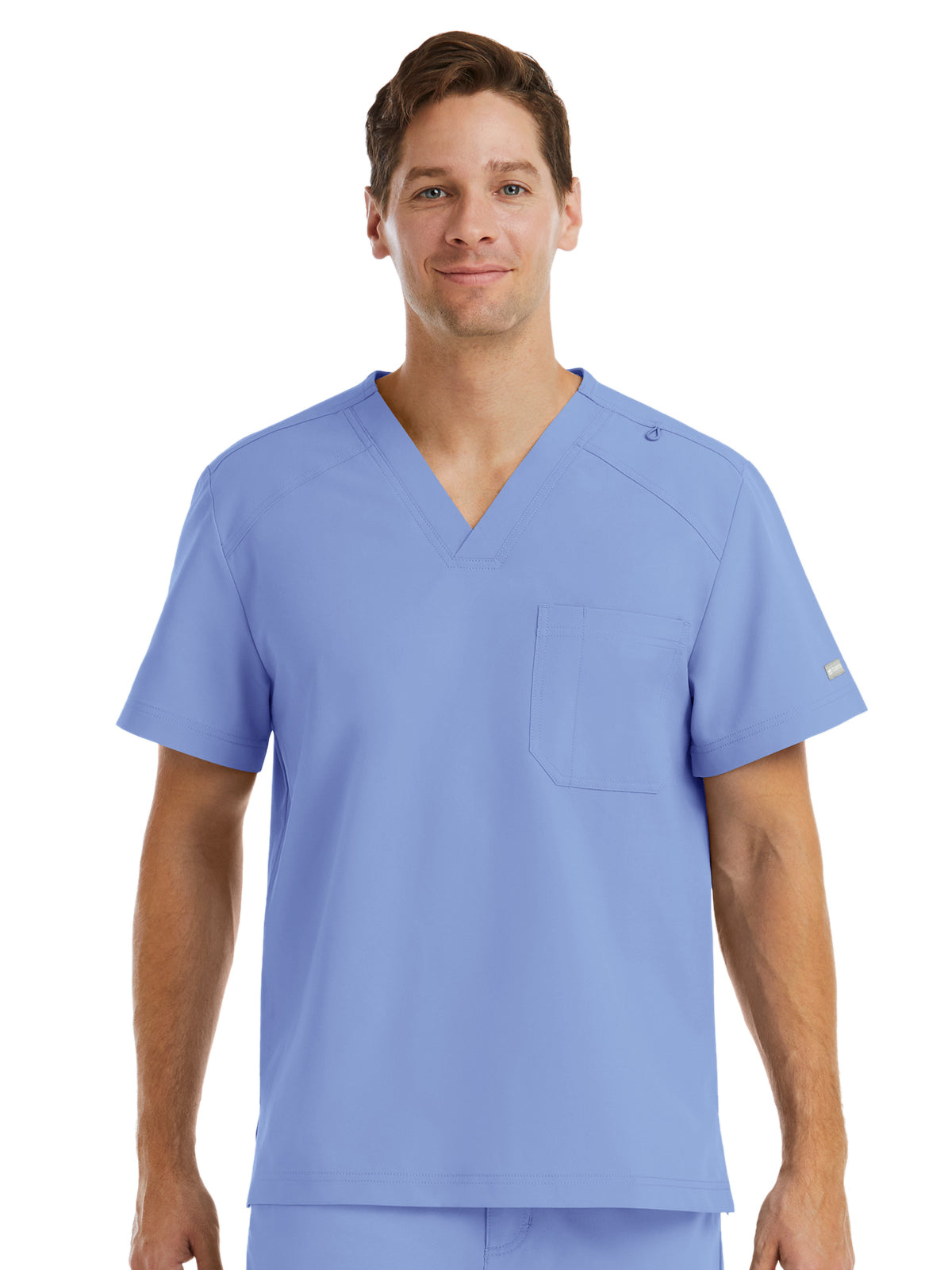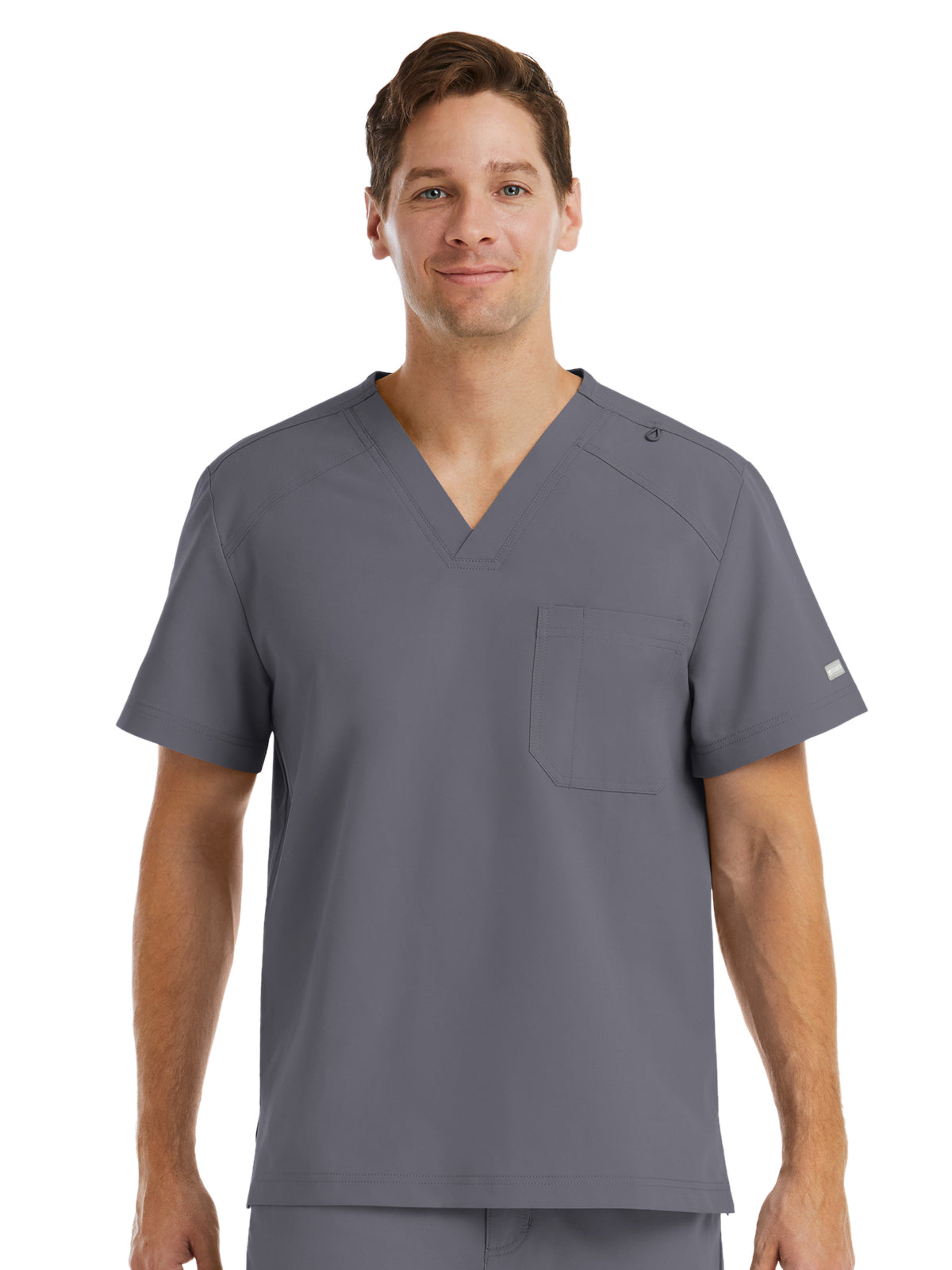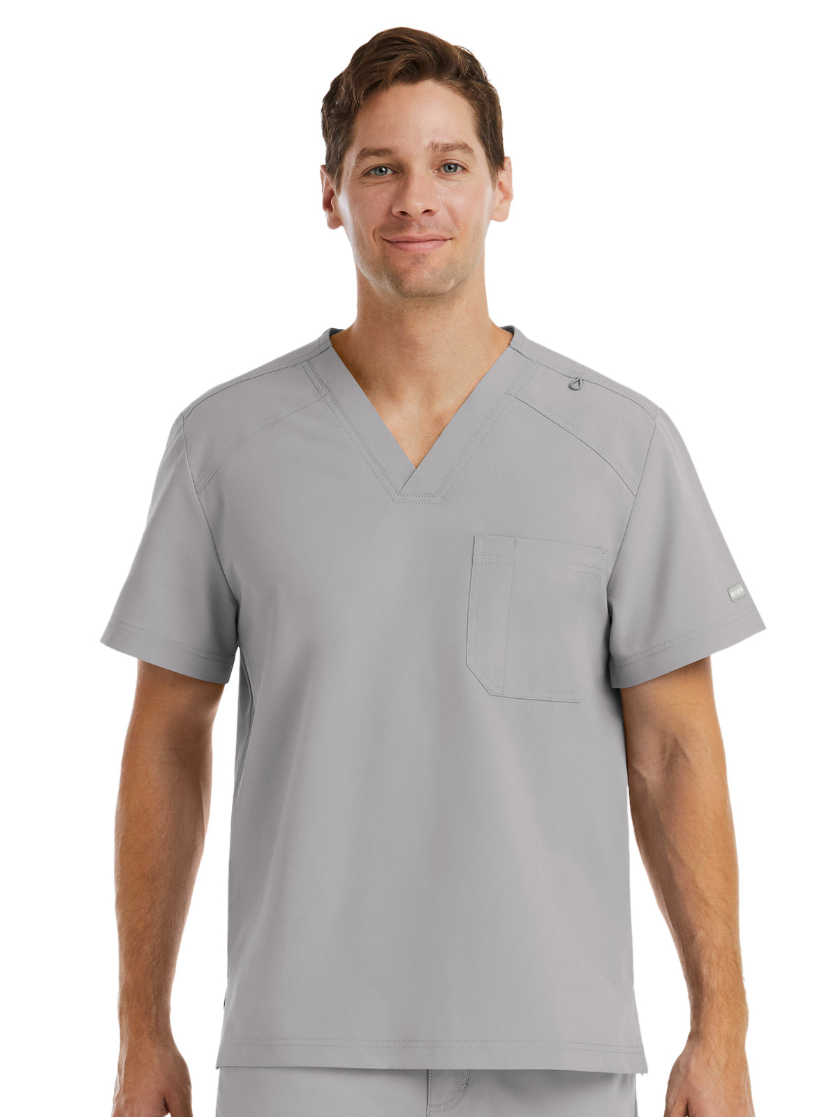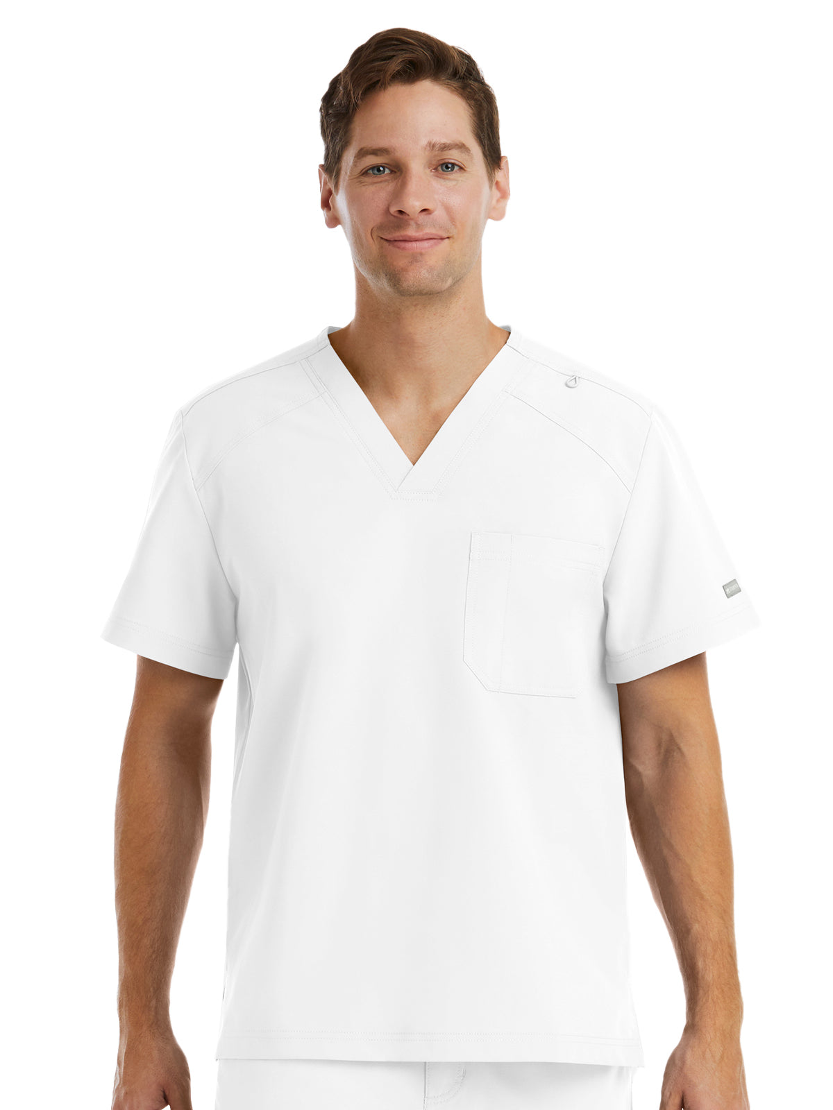 Men’s V-neck top. Decorative logo tape at the inner back neckline. Functional dyed-to-match utility loop at shoulder seam. One chest pocket with a pen slot. Side vents. Center back length: 28.5".