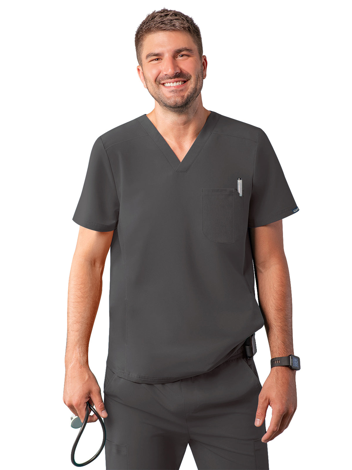 This men's v-neck top features a forward shoulder for a modern look. Four-way stretch fabric for limitless motion. Two hidden side entry pockets. One shaped chest pocket with pen storage pocket. Woven label. Center back length: 28.5".