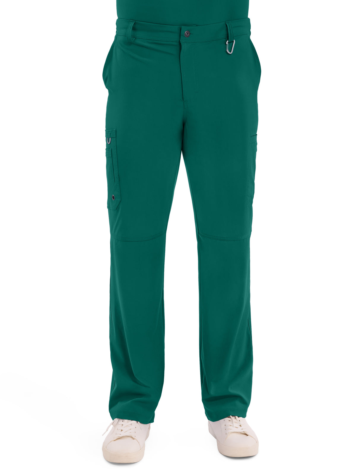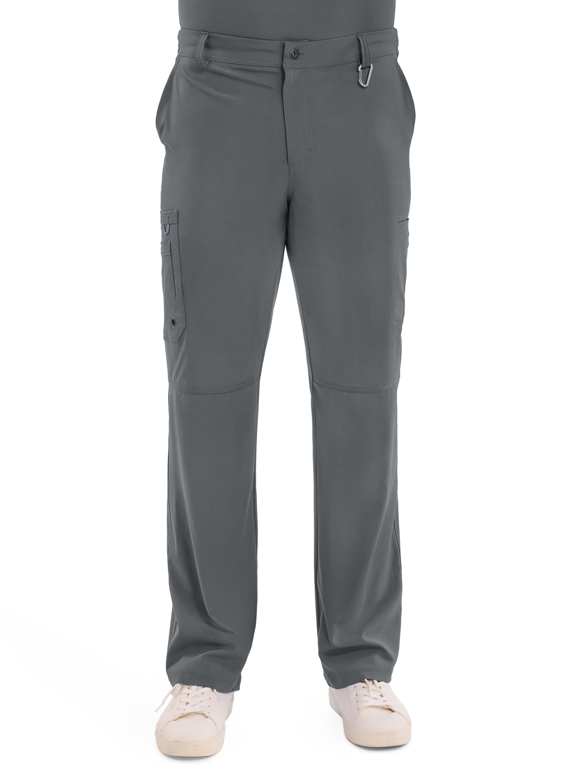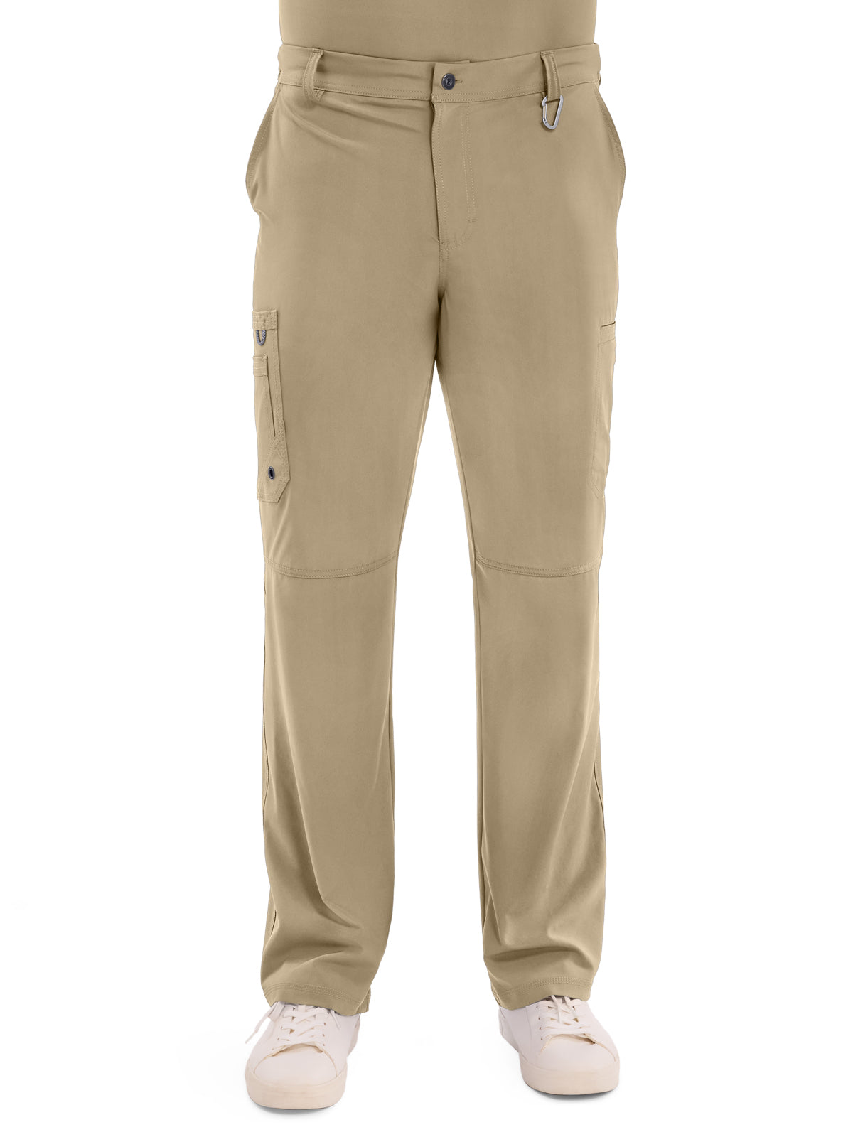 A Men's Modern fit tapered leg pant features an inside functional drawstring, back elastic waistband with rib-knit, five belt loops, a zip fly with button closure and a hidden inseam gusset for extra ease. Also featured are two front angled pockets, a right double cargo pocket with bungee loop and grommet, left welt cargo pocket, back patch pocket and knee seams. Inseam: Regular 32", Tall 35", Short 29.5".