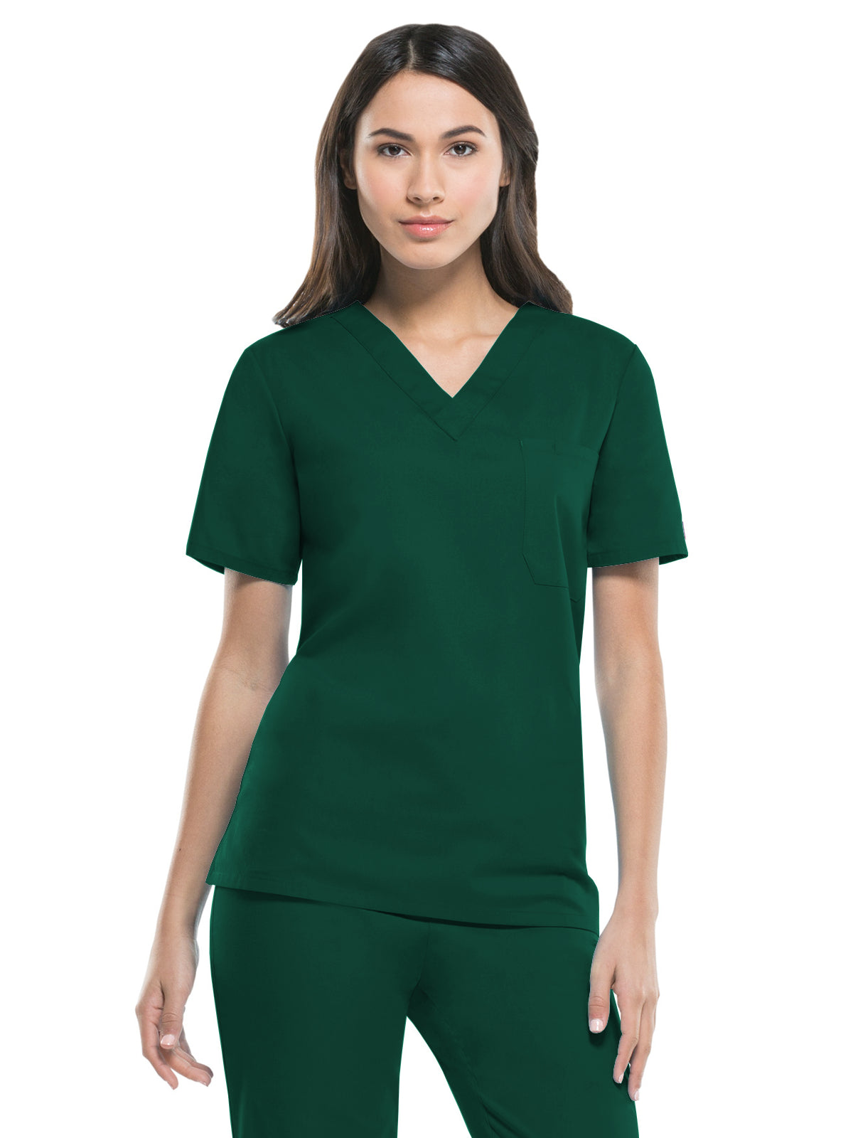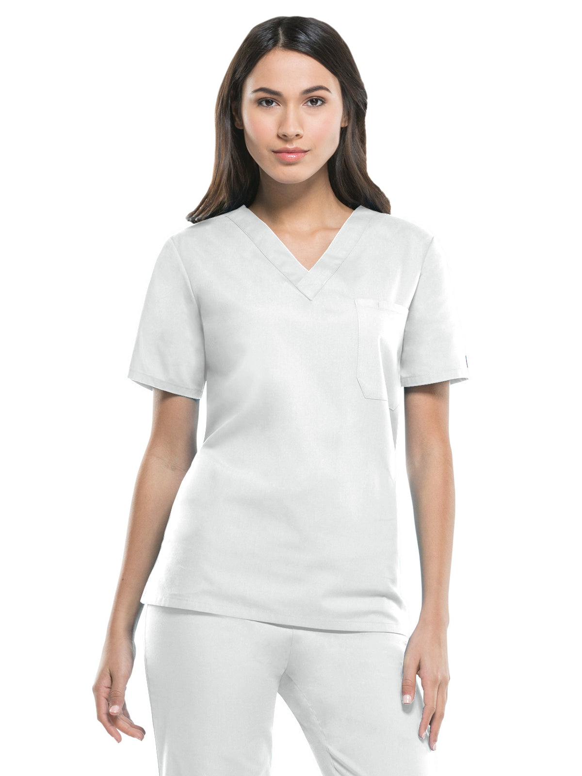 A unisex v-neck top features Dickies logo twill tape at the back neck, a front chest pocket with a bar tacked pencil slot and side vents. Center back length: 28".
