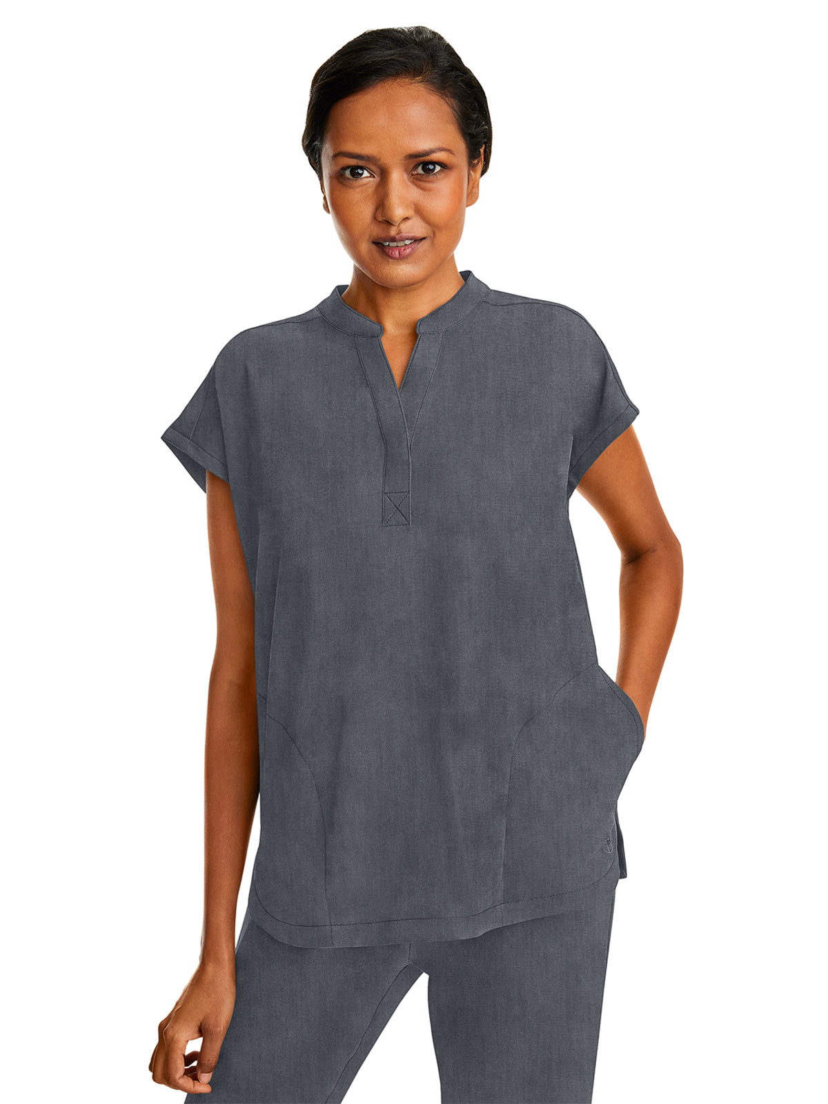 This Journey top features a relaxed fit with a snap closure at the neckline and a rounded hemline. Pockets include two welt pockets. Center back length: 26"