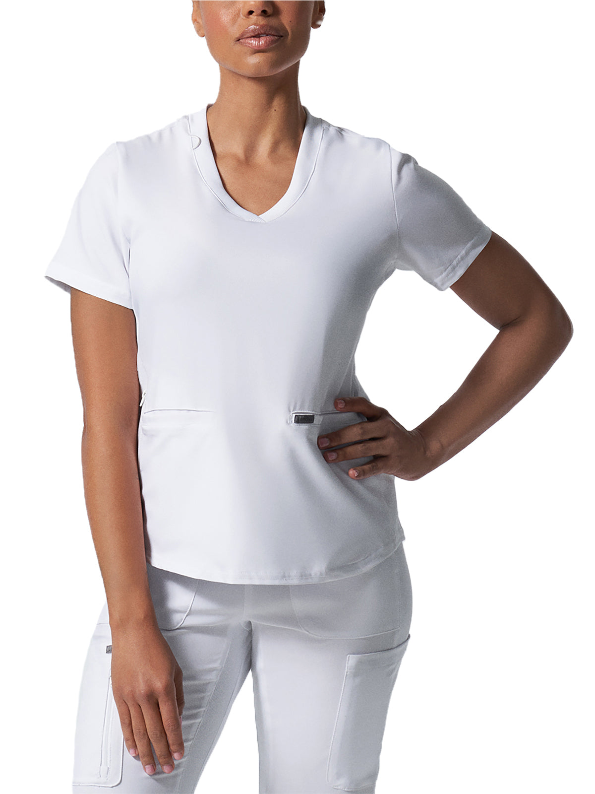 You will fall in love with this women's scrub top with its soft rib-knit side panels and neckband, which allow for comfort and ease of movement. Two front welt pockets and a badge loop provide plenty of storage and an on-seam zipper pocket keeps your items secure. Our modern tailored fit flatters your shape, while our moisture-wicking super stretch fabric provides the comfort and flexibility your work requires throughout the day. Center back length: 26"