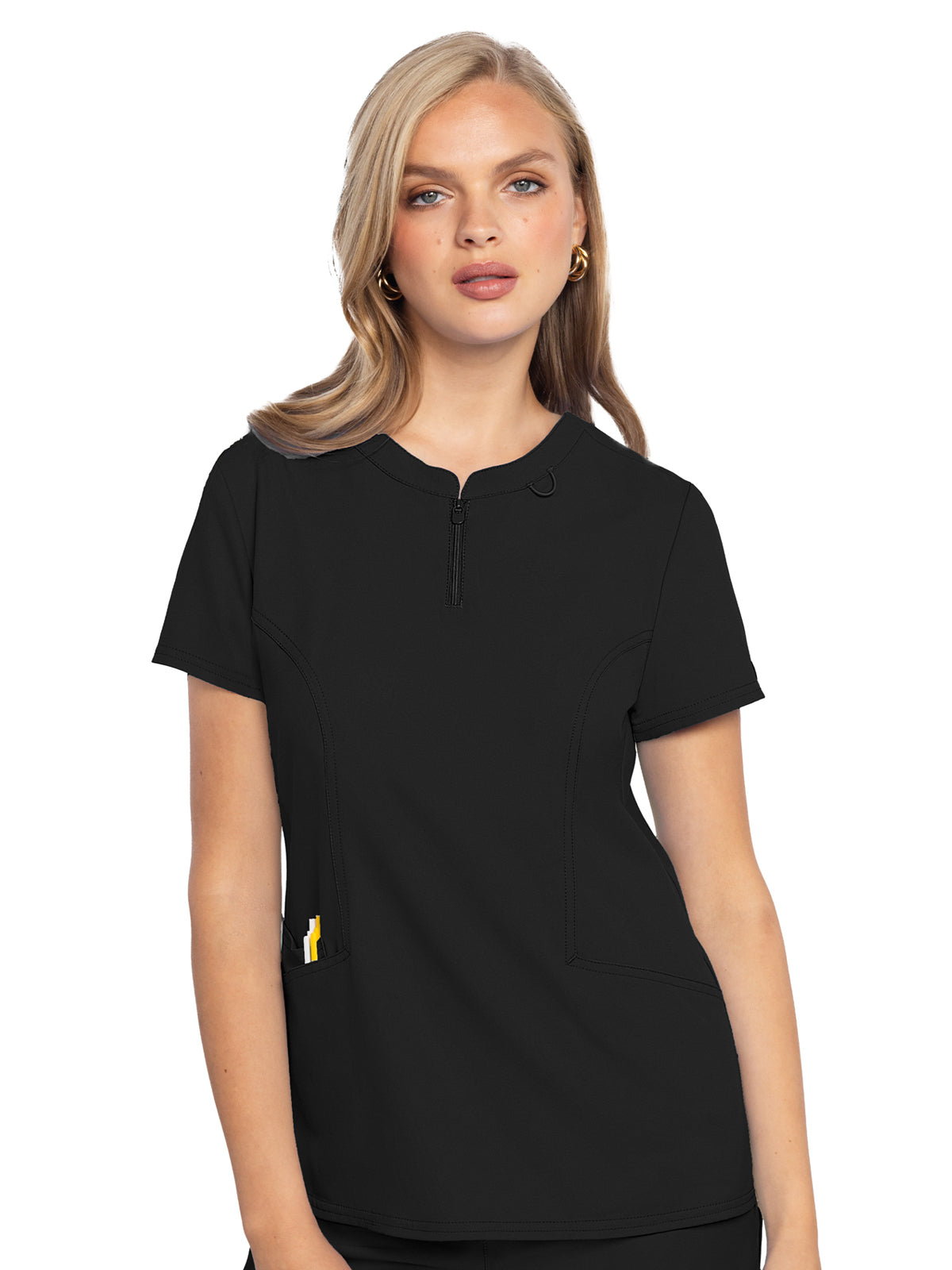 This Modern Classic fit round neck top has a partial zip front, a badge ID bungee loop on the wearer's left, plus front and back princess seams. There are three pockets: two front pockets, and one utility pocket on there wearer's right side. A rounded hem completes the look. Center back length: 25 1/2".