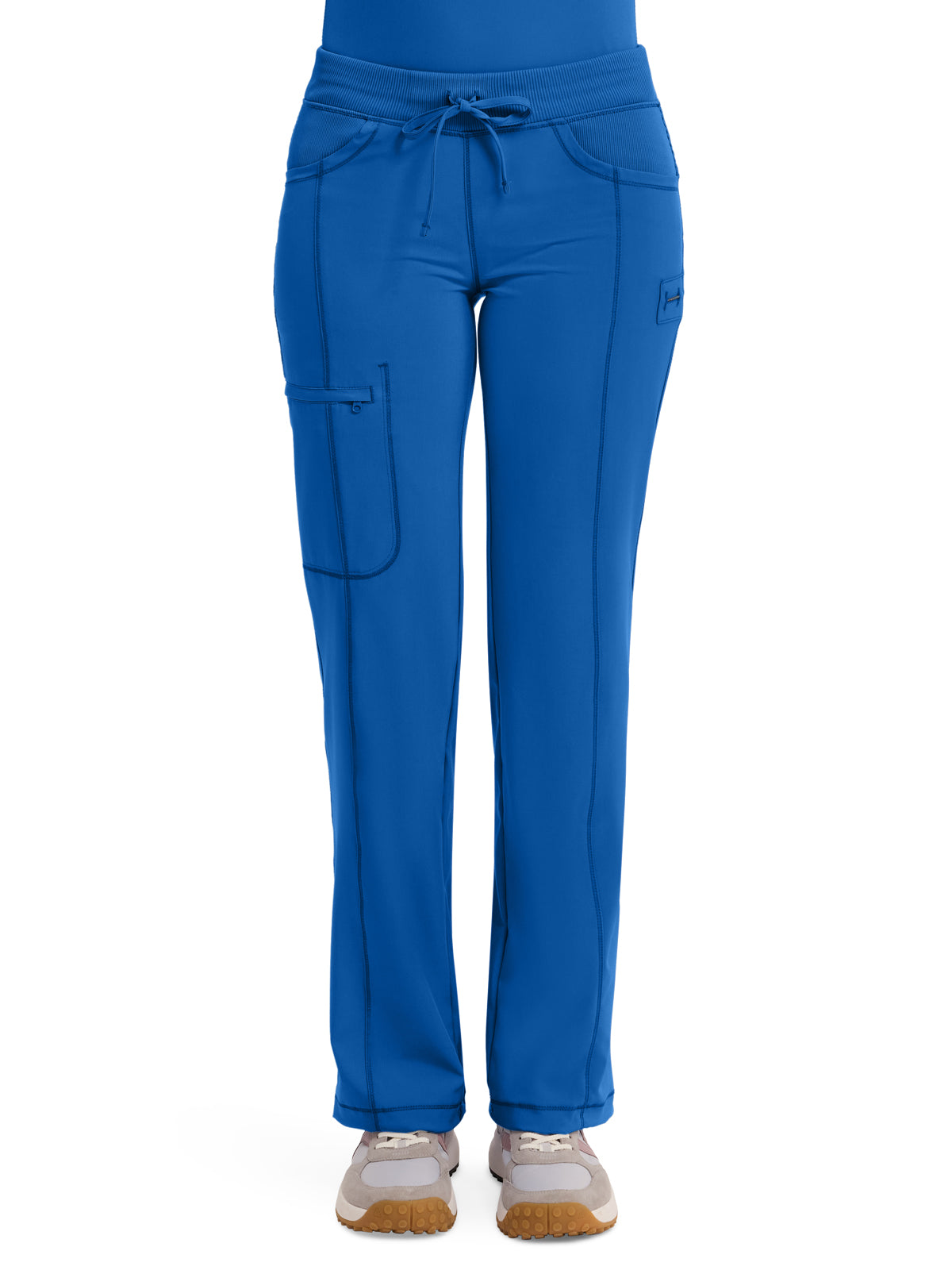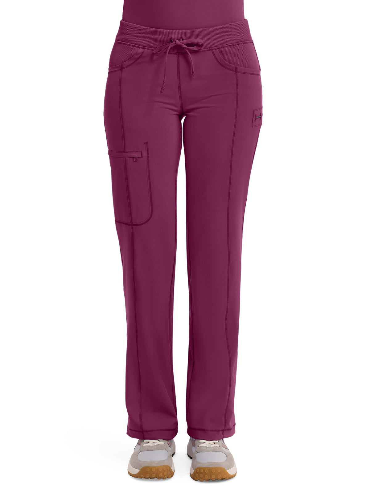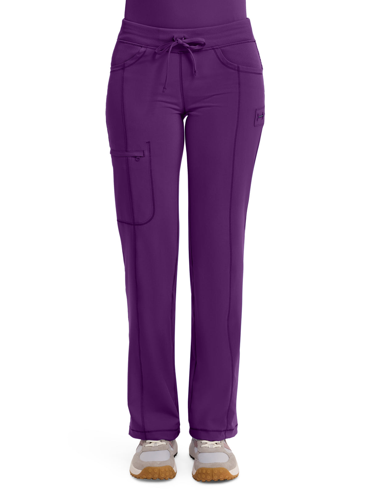 A Contemporary fit, low rise, straight leg pant features an elastic knit waistband and adjustable drawstring. Also featured are rib knit front and back yokes, angled front pockets, front leg seams with a zip closure cargo pocket, one back patch pocket, a bungee instrument loop below left pocket, a bungee cord with a toggle at the leg hems for adjustability and coverstitch detail throughout. Inseam: 31" The comfortable stretch poplin fabric and super stretchy rib knit is the perfect combo for healthcare professionals.