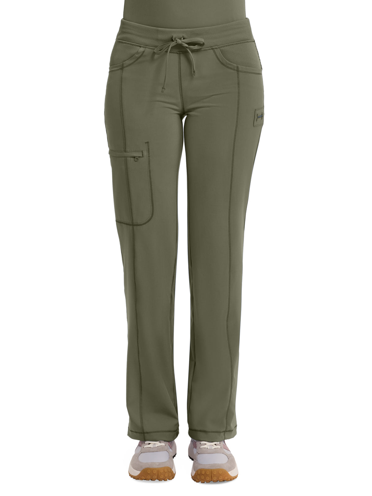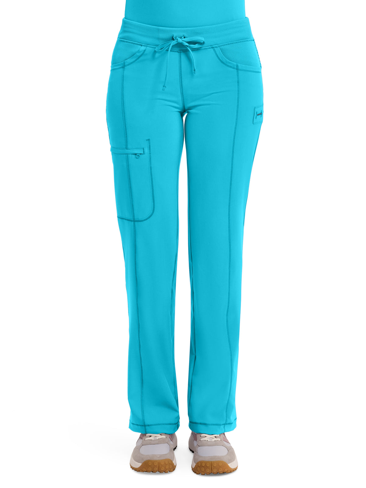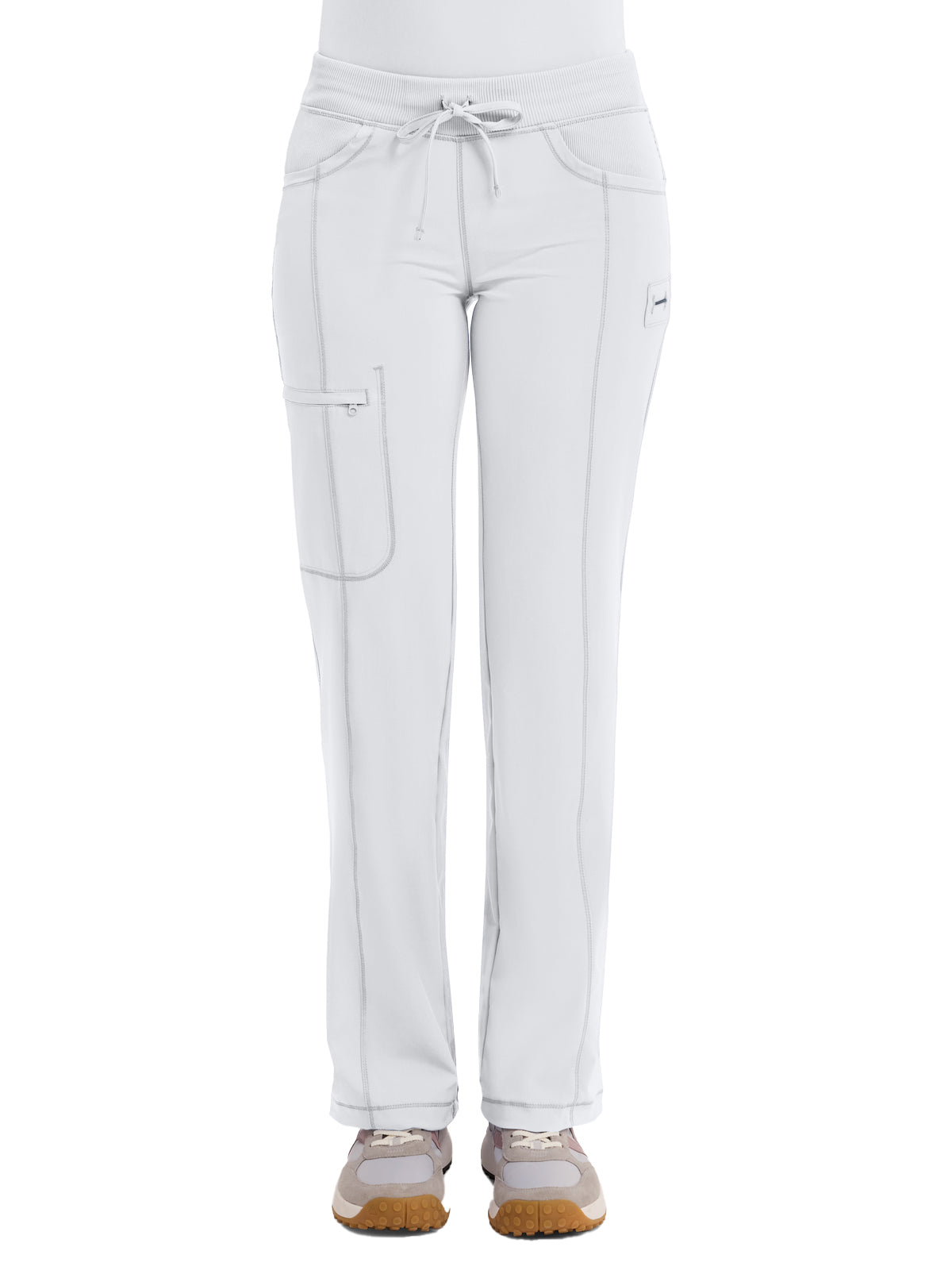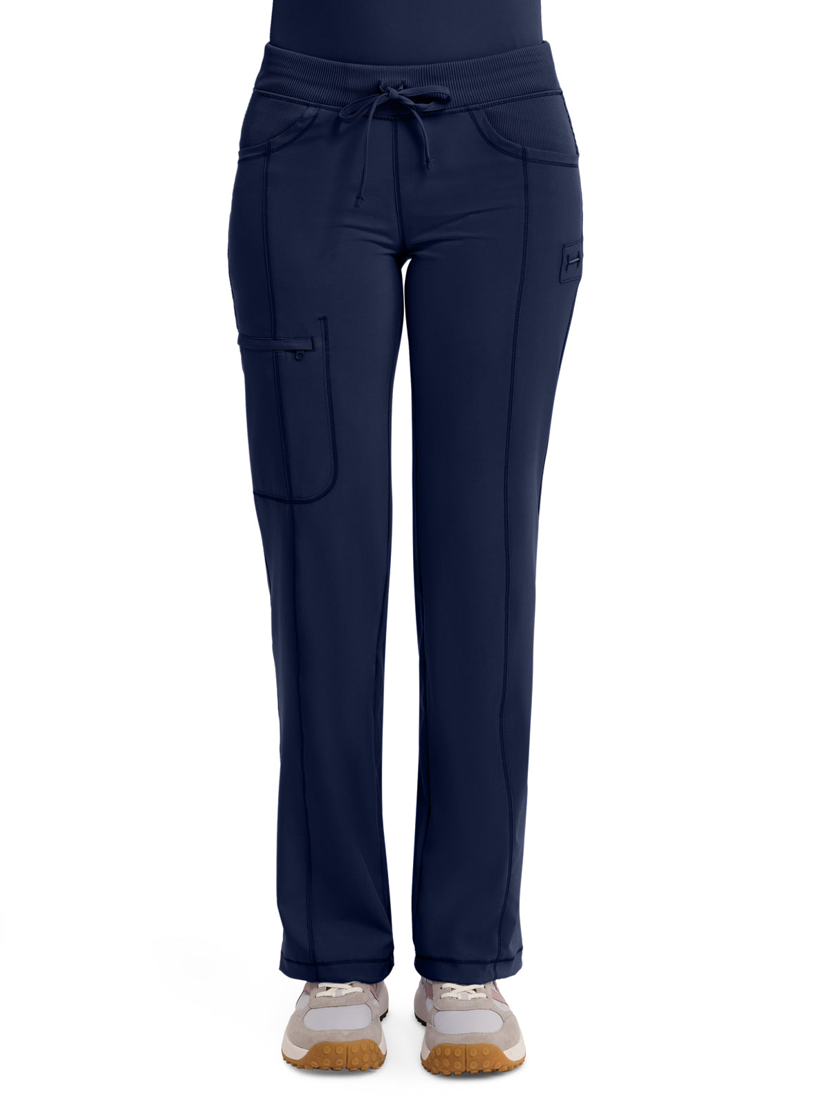 A Contemporary fit, low rise, straight leg pant features an elastic knit waistband and adjustable drawstring. Also featured are rib knit front and back yokes, angled front pockets, front leg seams with a zip closure cargo pocket, one back patch pocket, a bungee instrument loop below left pocket, a bungee cord with a toggle at the leg hems for adjustability and coverstitch detail throughout. Inseam: 31" The comfortable stretch poplin fabric and super stretchy rib knit is the perfect combo for healthcare professionals.