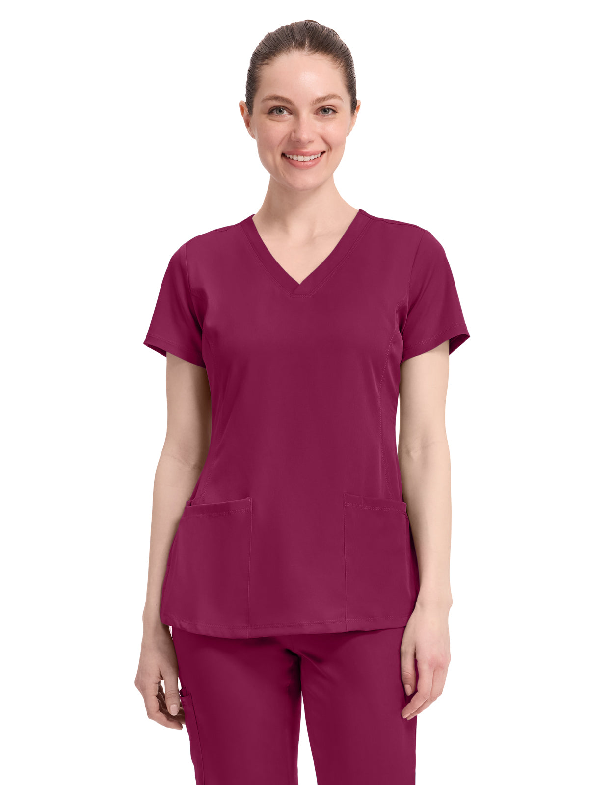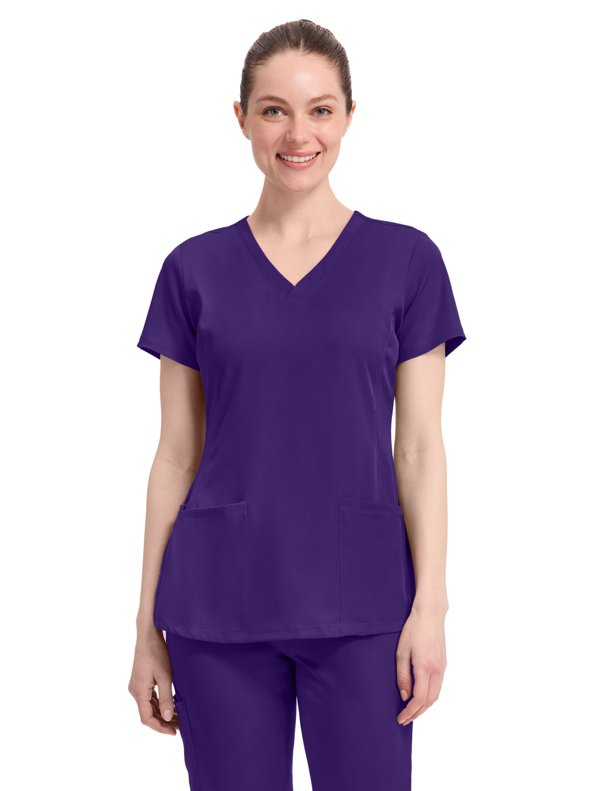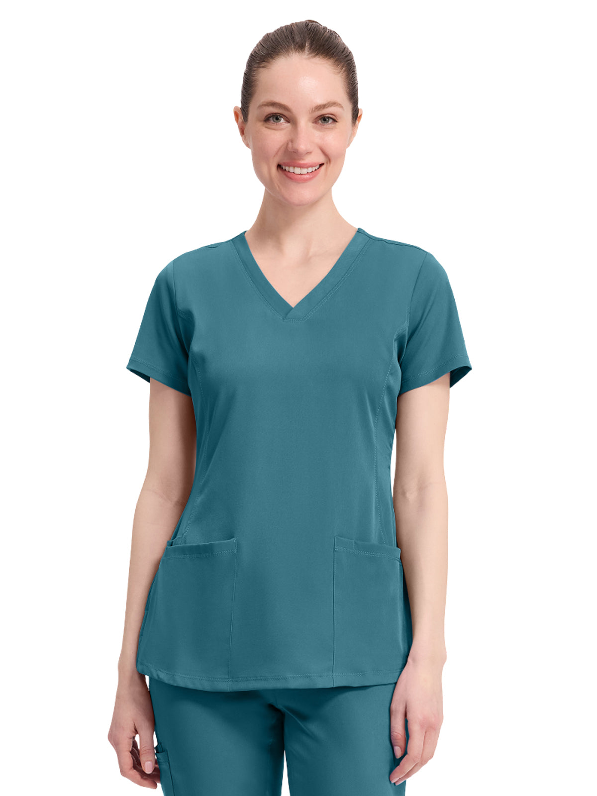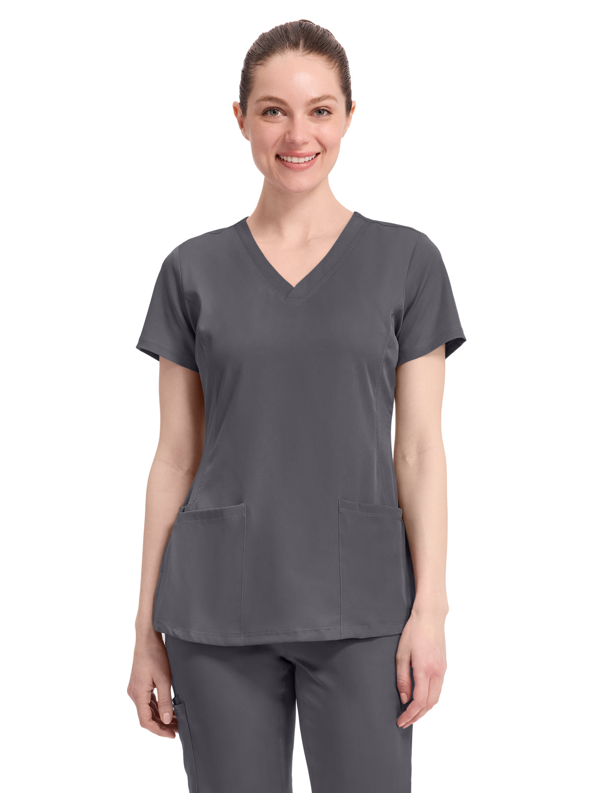 V-neck scrub top with 2 pockets and 1 media pocket. Wicks moisture quickly. Optimum mobility and comfort. Wash, dry, and wear. Won't fade. Elegant styling. Well-balanced fit. Center back length: 26.5".