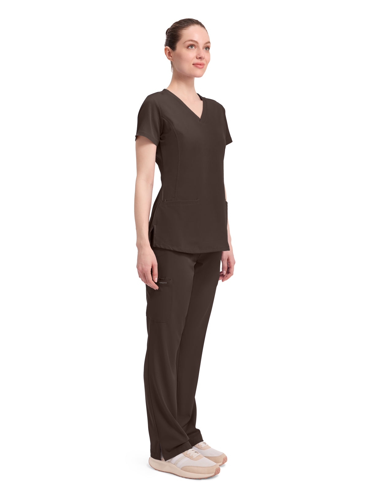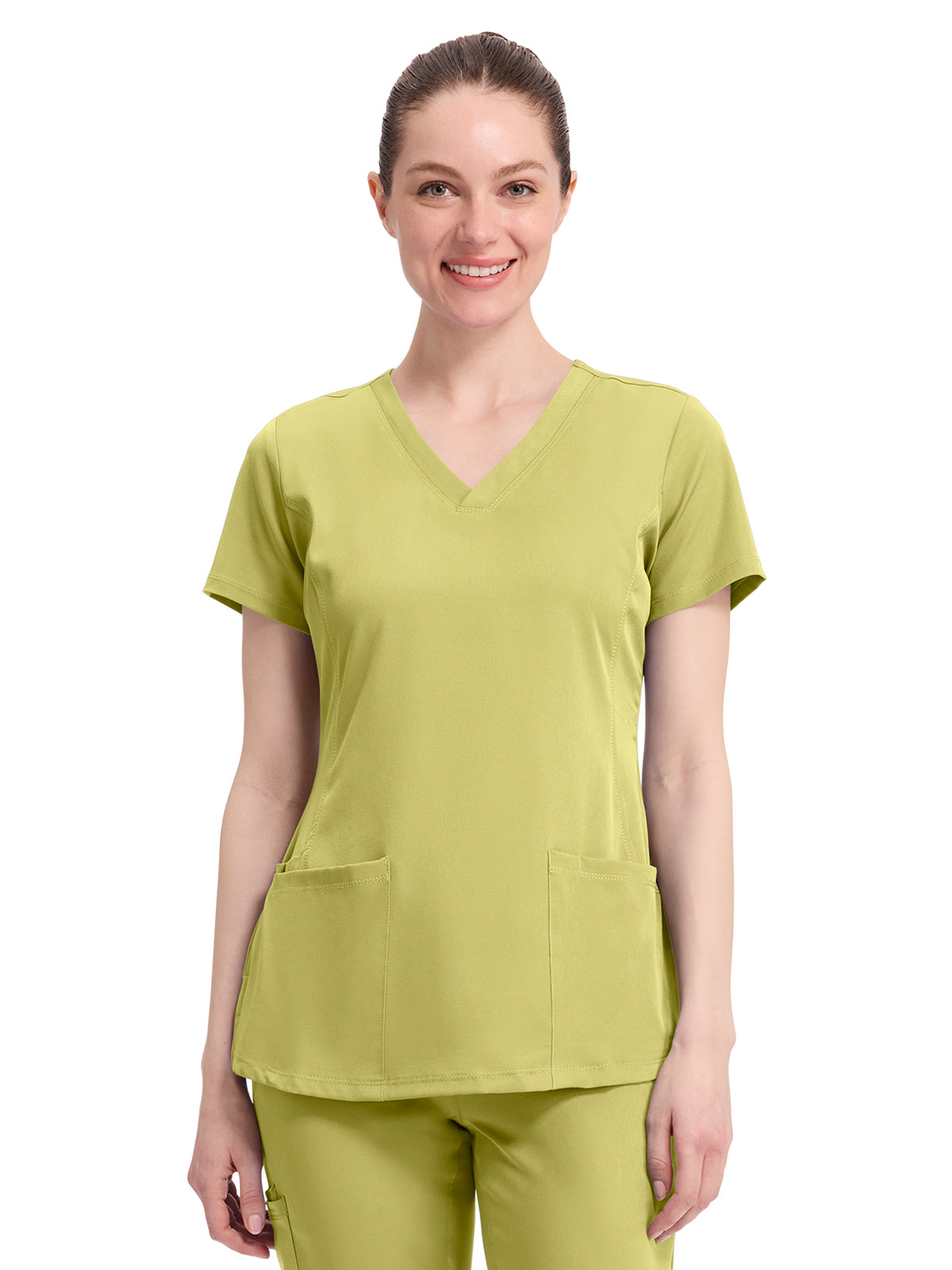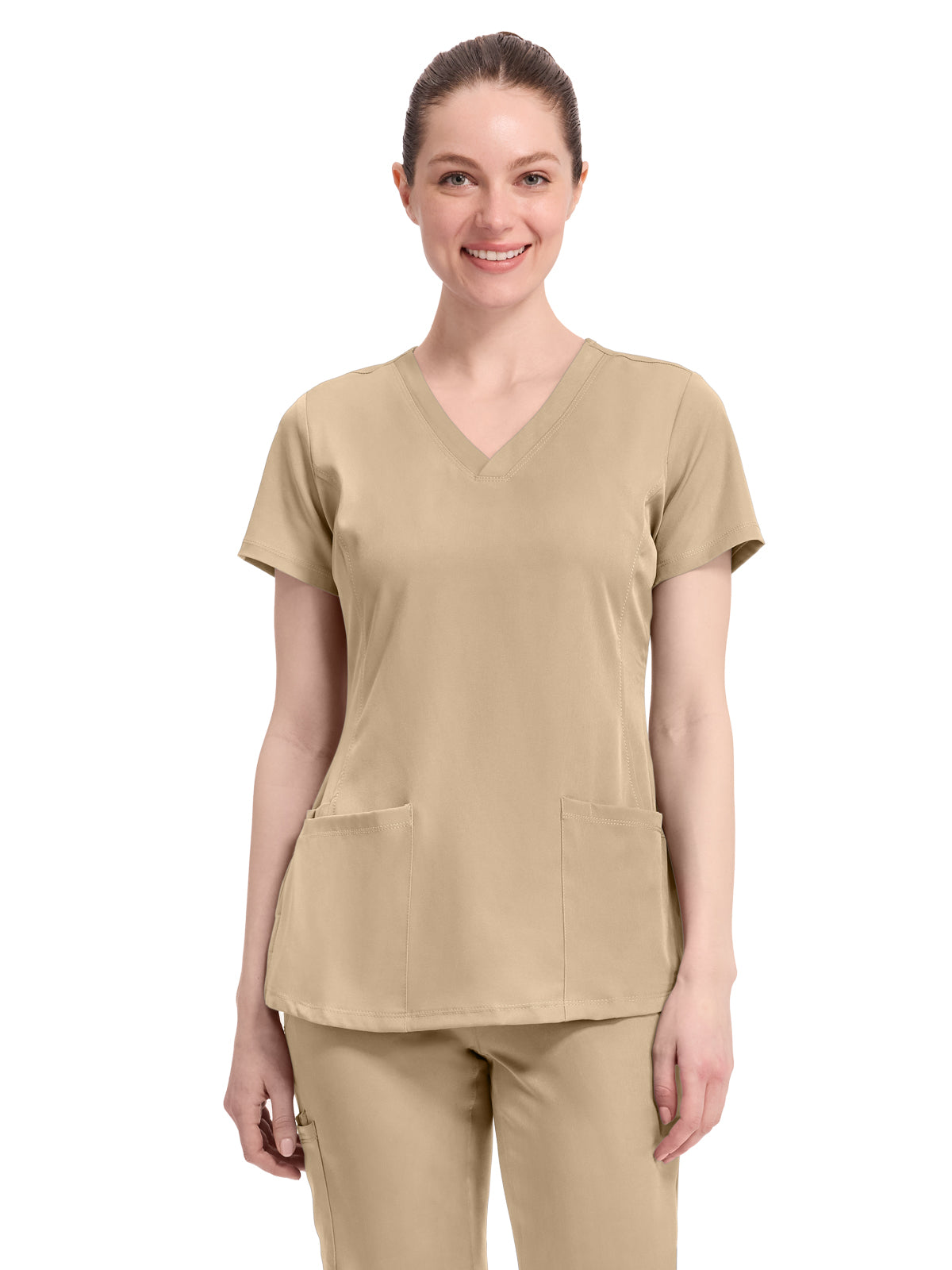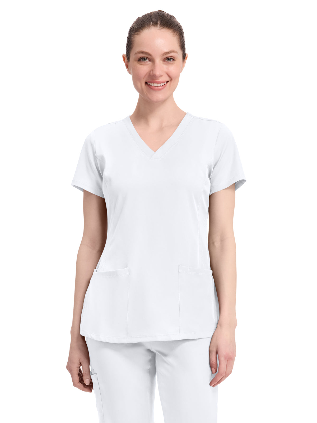 V-neck scrub top with 2 pockets and 1 media pocket. Wicks moisture quickly. Optimum mobility and comfort. Wash, dry, and wear. Won't fade. Elegant styling. Well-balanced fit. Center back length: 26.5".