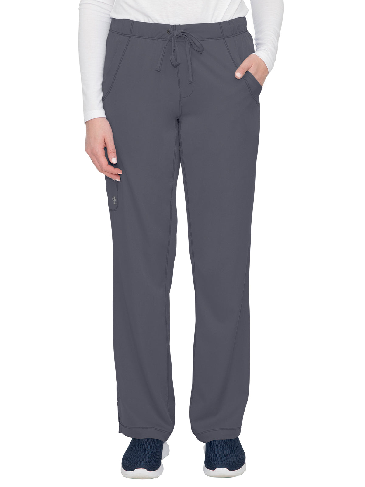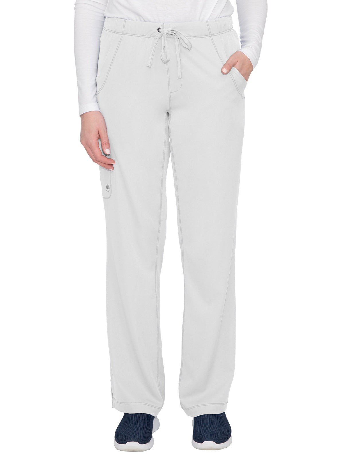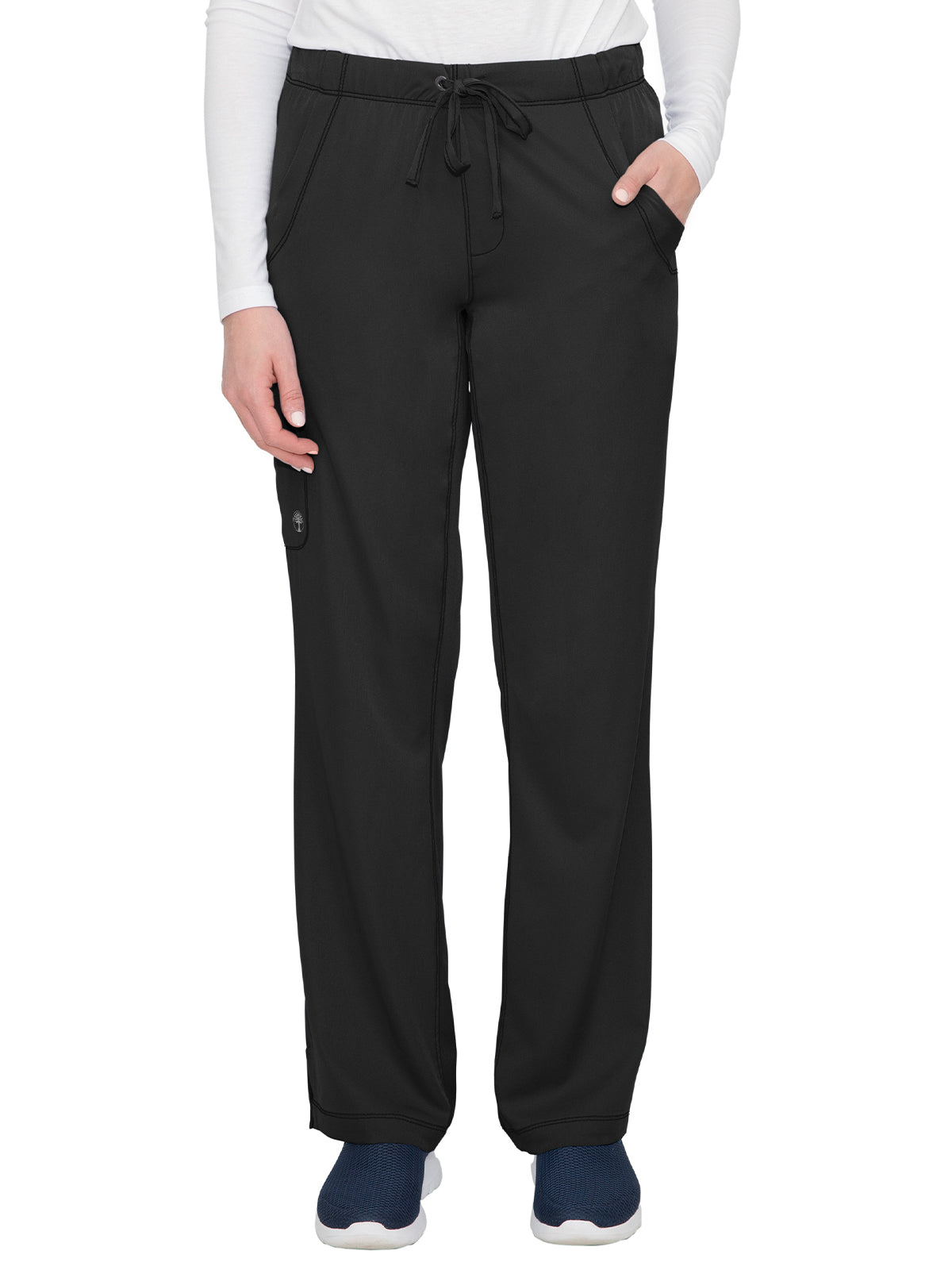Straight leg pants with 5 pockets and 1 media pocket. Full elastic waistband. Wicks moisture quickly. Optimum mobility and comfort. Wash, dry, and wear. Won't fade. Elegant styling. Well-balanced fit. Regular inseam: 31.5". Petite inseam: 29.5". Tall inseam: 33.5".