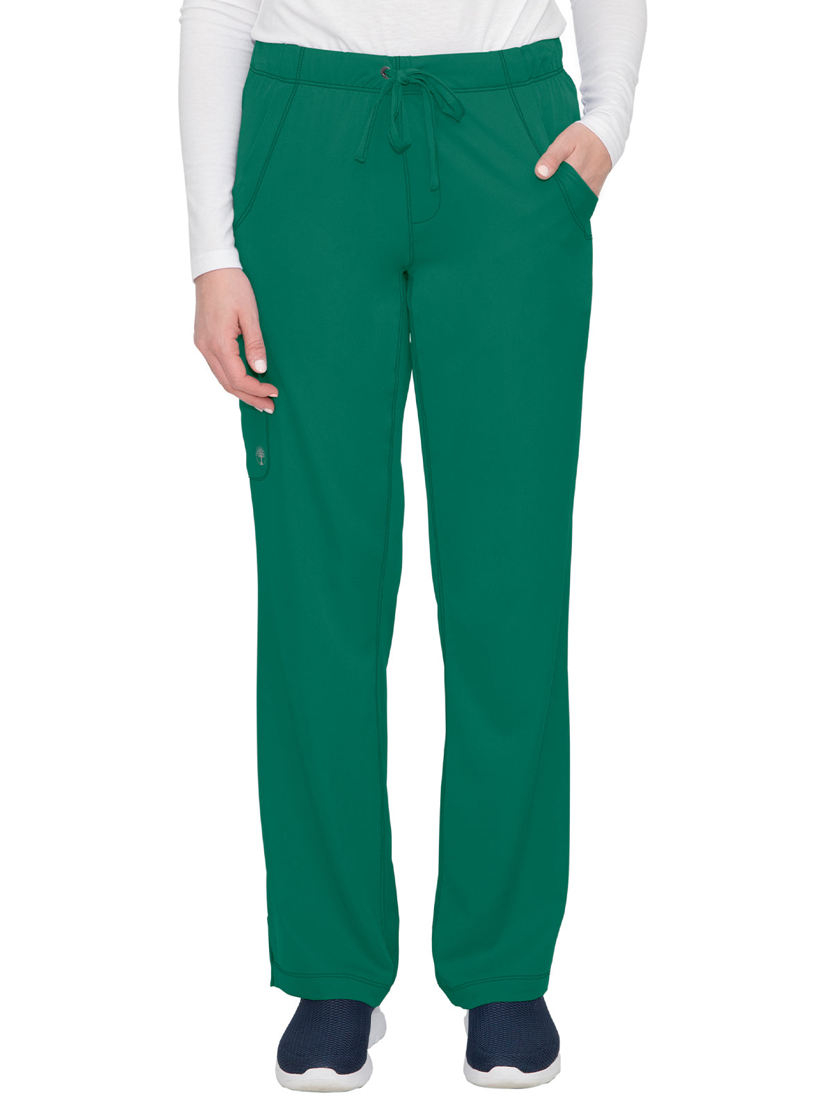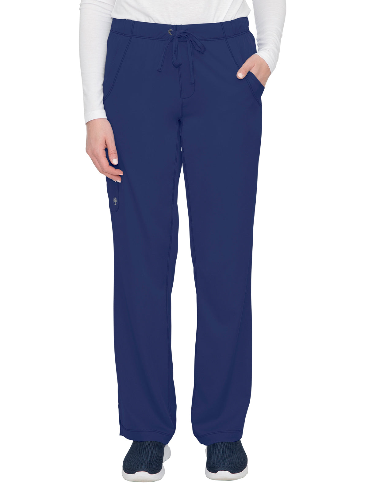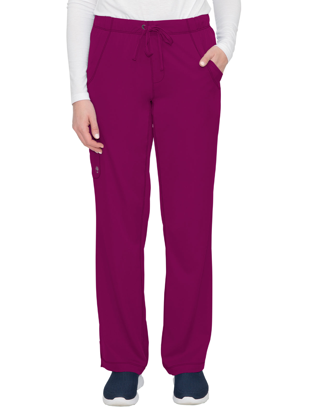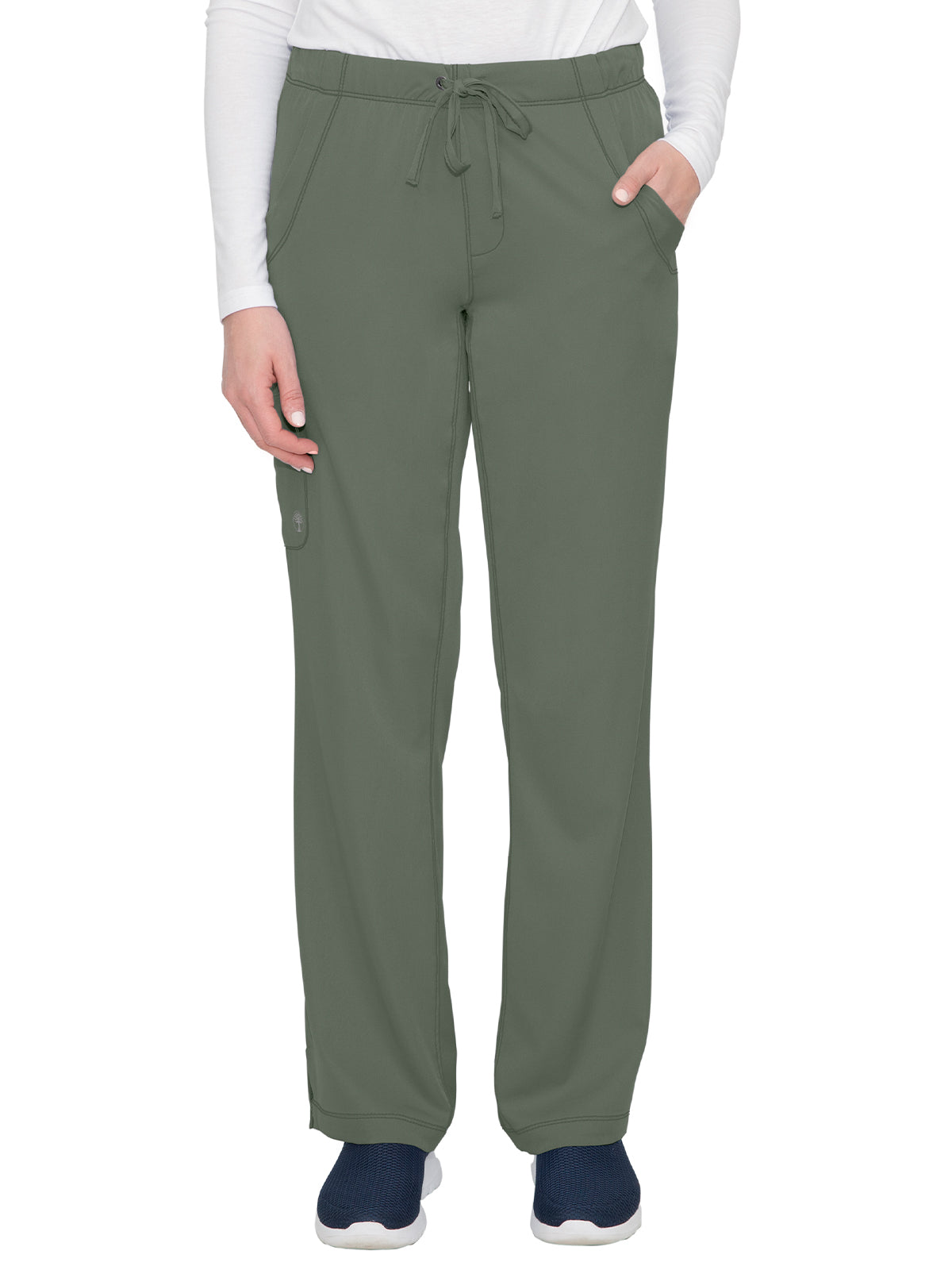 Straight leg pants with 5 pockets and 1 media pocket. Full elastic waistband. Wicks moisture quickly. Optimum mobility and comfort. Wash, dry, and wear. Won't fade. Elegant styling. Well-balanced fit. Regular inseam: 31.5". Petite inseam: 29.5". Tall inseam: 33.5".
