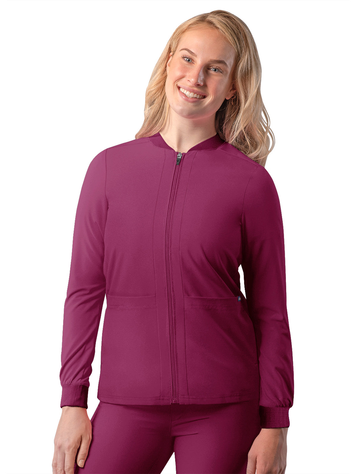 This women's bomber jacket features a self-lock branded zipper, four-way stretch fabric for limitless motion. It also features four pockets: two large top entry and two side entry. Double layer rib knit at the neck. Forward shoulder for a modern look. Woven label. Double layer rib knit at cuff. Center back length: 26".