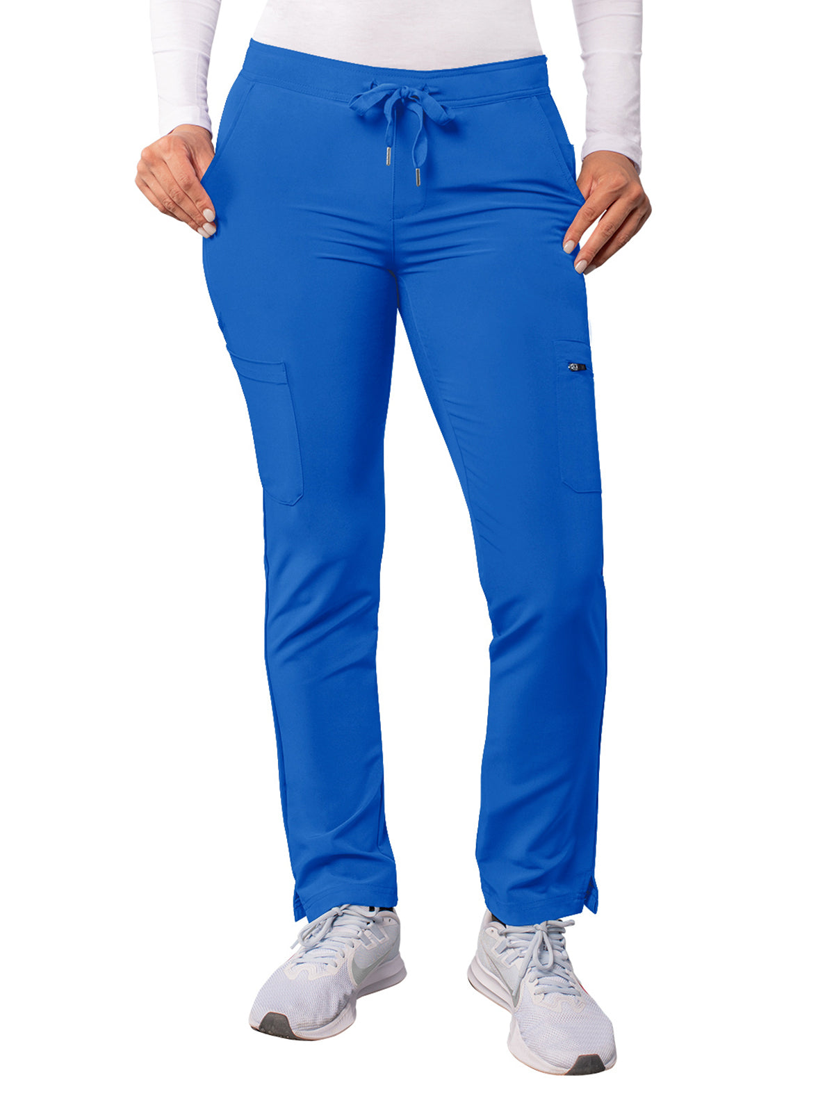 This women's skinny leg cargo pant features a soft stretch-out drawstring. It also features two deep front slash pockets, one small internal pocket on the left side, and one large cargo pocket with a scissor pocket. Four-way stretch fabric for limitless motion. Pant leg side vents for comfort. Skinny leg fit. One large zippered pocket. Stitched mock fly. Flat front waistband. Regular Inseam: 31". Petite Inseam: 28.5". Tall Inseam: 33.5".