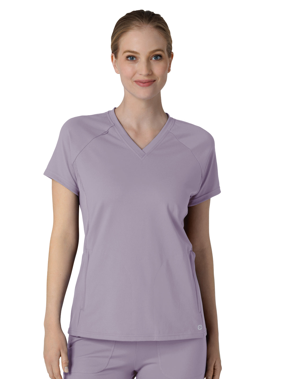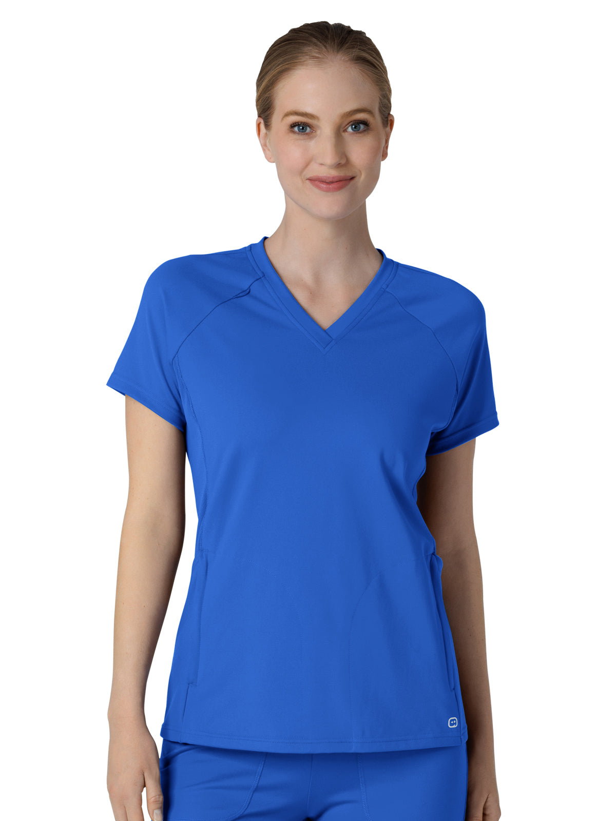 Knit raglan sleeves and comfortable details make this women's scrub top a perfect match for your busy shifts. It's built from soft and stretchy fabric that makes movement easy. Because lifting and leaning are part of the job, our Flex-n-Reach panels provide extra stretch where you need it most. A curved droptail hem gives you a flattering fit plus coverage that lets you travel confidently through your day. It pairs perfectly with slim-fit scrub pants, delivering a modern look that's polished and professional. Two front zip pockets and one side top-loading pocket hold all the tools and essentials you need for a successful day balancing your to-do list and unexpected tasks. Keep your badge at the ready thanks to a loop on one shoulder, then when you don't need it, it stays out of your way. This scrub top has a modern fit that skims your body without feeling too tight or too loose. It's part of our RENEW collection of eco-friendly scrubs.