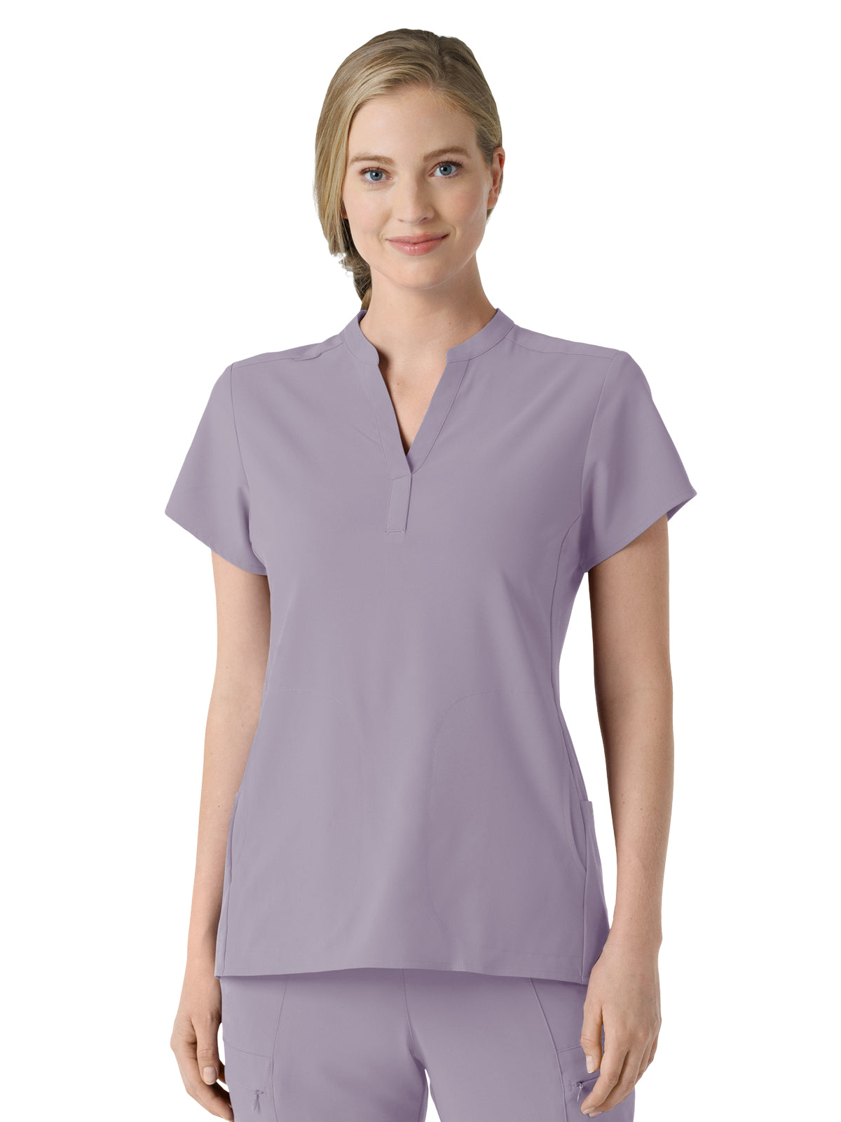 As a care provider, you know that details matter. This women's scrub top is designed with thoughtful touches that make all the difference in simplifying your day. The mandarin collar puts a polished spin on everyday practicality, giving you a professional, stylish look that lasts through long shifts and busy days. Keep your glasses or your badge on a loop on the lower neckline or on another loop right at the shoulder. Tote tools and essentials from room to room with side-entry pockets on the front and top-entry pockets on the side panels. The back yoke with pleats helps give the silhouette shape, and the shirttail with vents makes moving around feel easy and restriction-free. The stretchy fabric moves with you in all the ways you stretch, bend, and reach from task to task. It's eco-friendly too, so you're caring for the planet as you're caring for your patients.