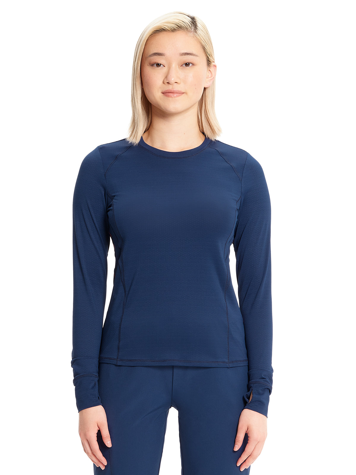 This Contemporary fit underscrub has a round neck and long sleeves with thumbholes on the cuffs. There are stylized front and back seams with coverstitching throughout. Contrast stitching on side seams adds extra detailing. A rounded high-low hem finishes this performance underscrub. Center back length: 25"