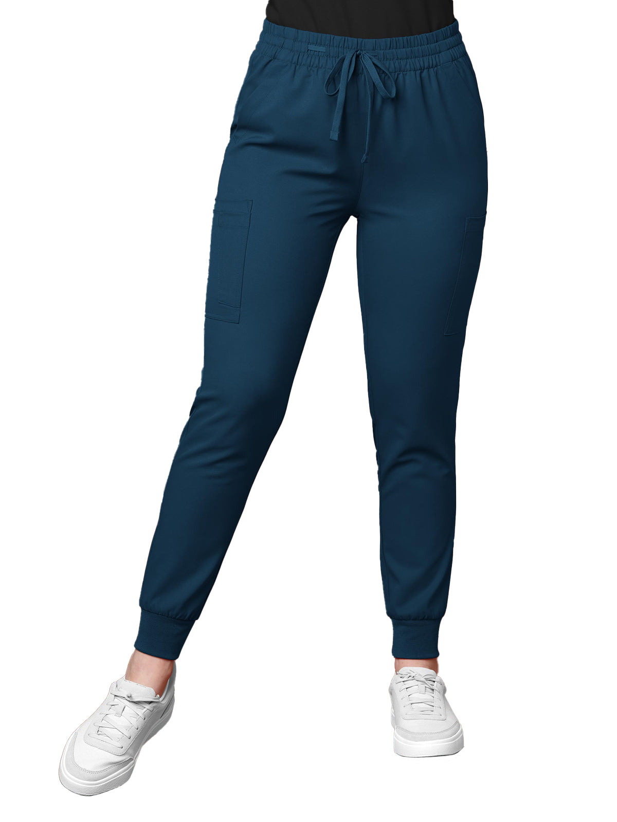 This women's jogger pant features two front slash pockets, two large cargo pockets with scissor pocket and interior accessory loop, two large flattering back patch pockets, soft elastic waist with full dyed-to-match drawstring that creates a secret utility loop, durable double-needle stitching, modern jogger leg fit, soft rib-knit cuffs at bottom hem, and the WonderWink natural white label. Size M leg opening: 4 1/2". Regular Inseam: 28 1/2" Petite Inseam: 26 1/2"