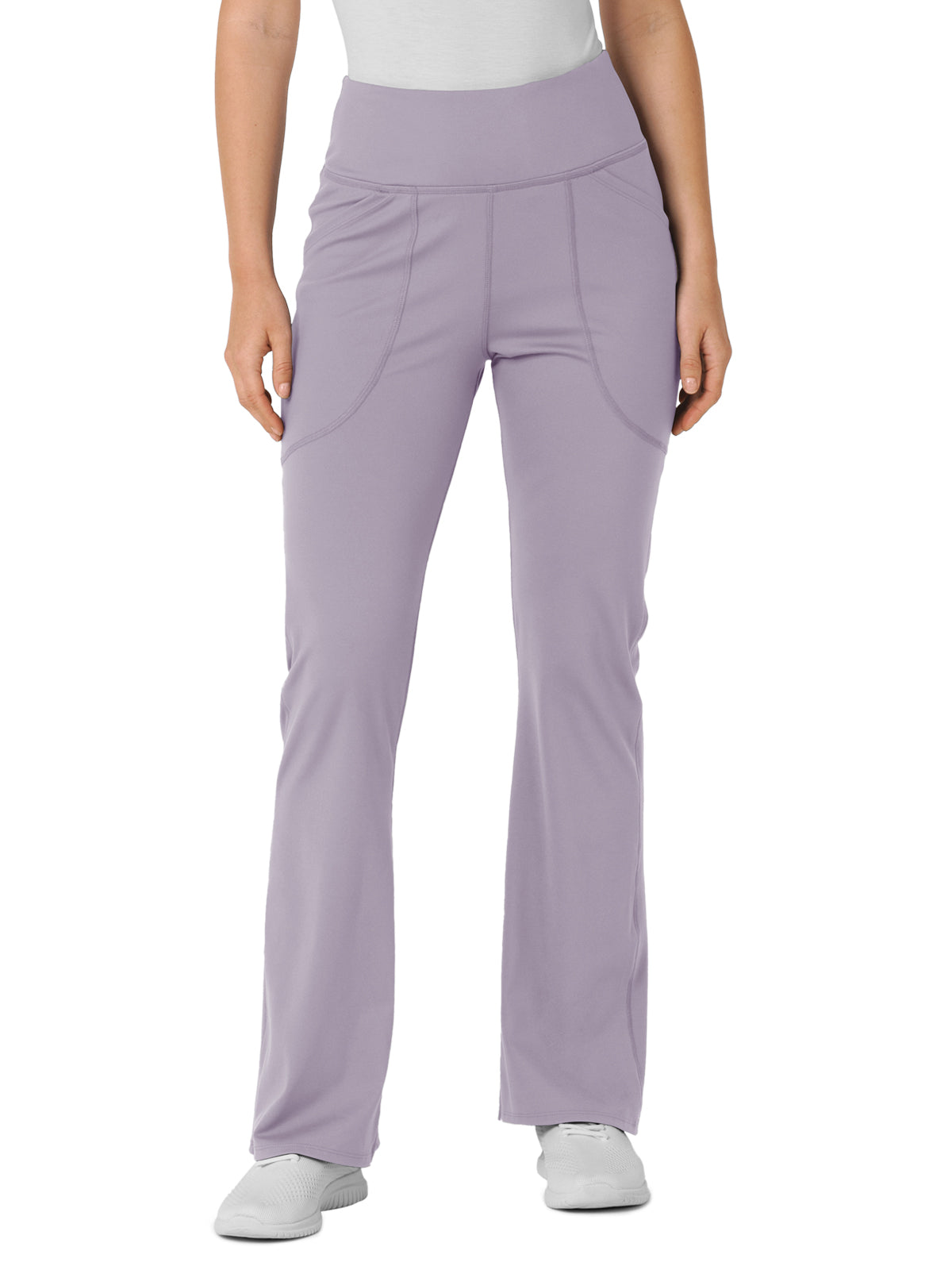 Get ready for your shift in a fresh style that's built with practical efficiency. These women's knit flared yoga scrub pants have a modern silhouette with a slightly flared leg thanks to inseam slits at the hem. They're made from a stretchy, soft, sustainably made material that feels like a second skin — ready to move with you as you get through a hectic shift or a fast-paced day in the clinic. The curved back seams shape a flattering fit, and a wide elastic waistband provides unrestricted movement from the moment you clock in all the way through the last patient rounds. Get the utility you need with two pockets at the front that are ideal for your phone, letting you slip it in for stay-put storage. Two side scissor pockets and a hidden card pocket at the waist hold small essentials so no matter where you're headed, you've got everything you need. Inseam (Size M): 32"