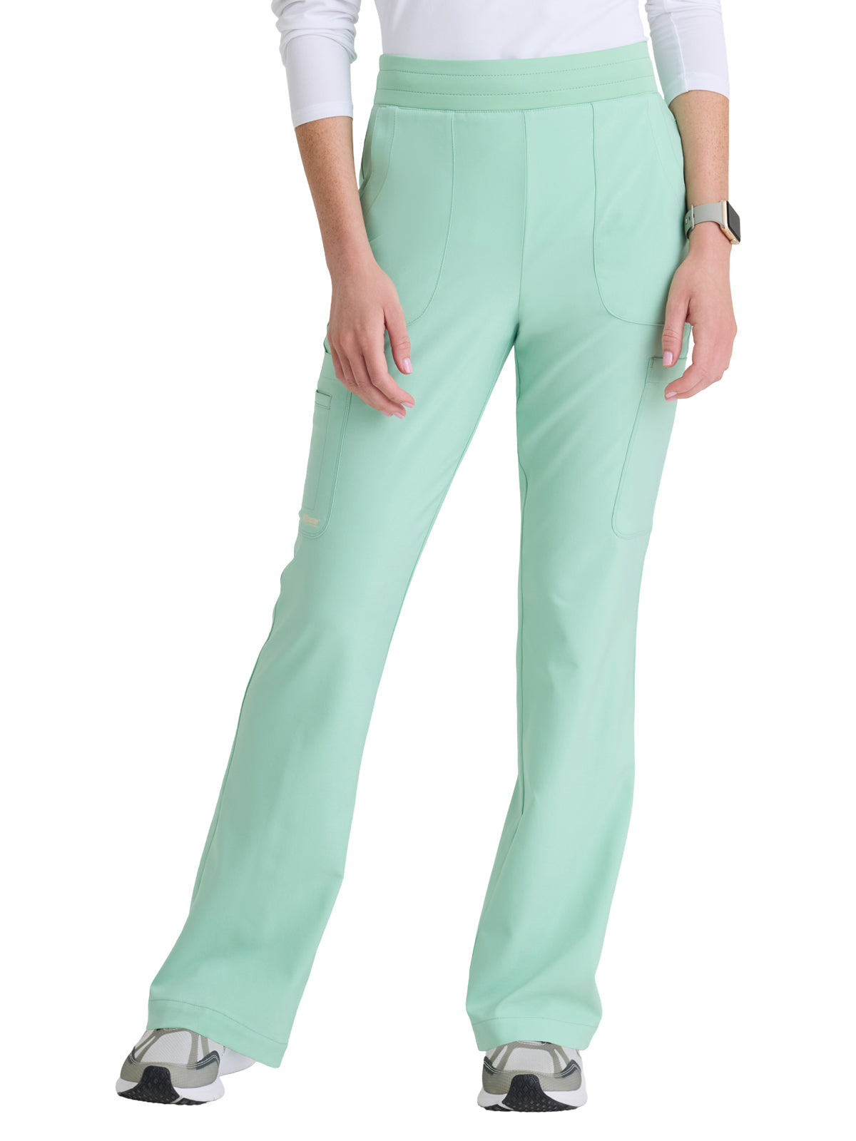 The Grey's Anatomy Evolve Stretch Sky pant features two curved front patch pockets, a double cargo pocket with top entry pocket, a back pocket, jersey knit full elastic waistband with inside drawcord, and 360 stretch moisture wicking wrinkle release fabric made from a recycled polyester blend.