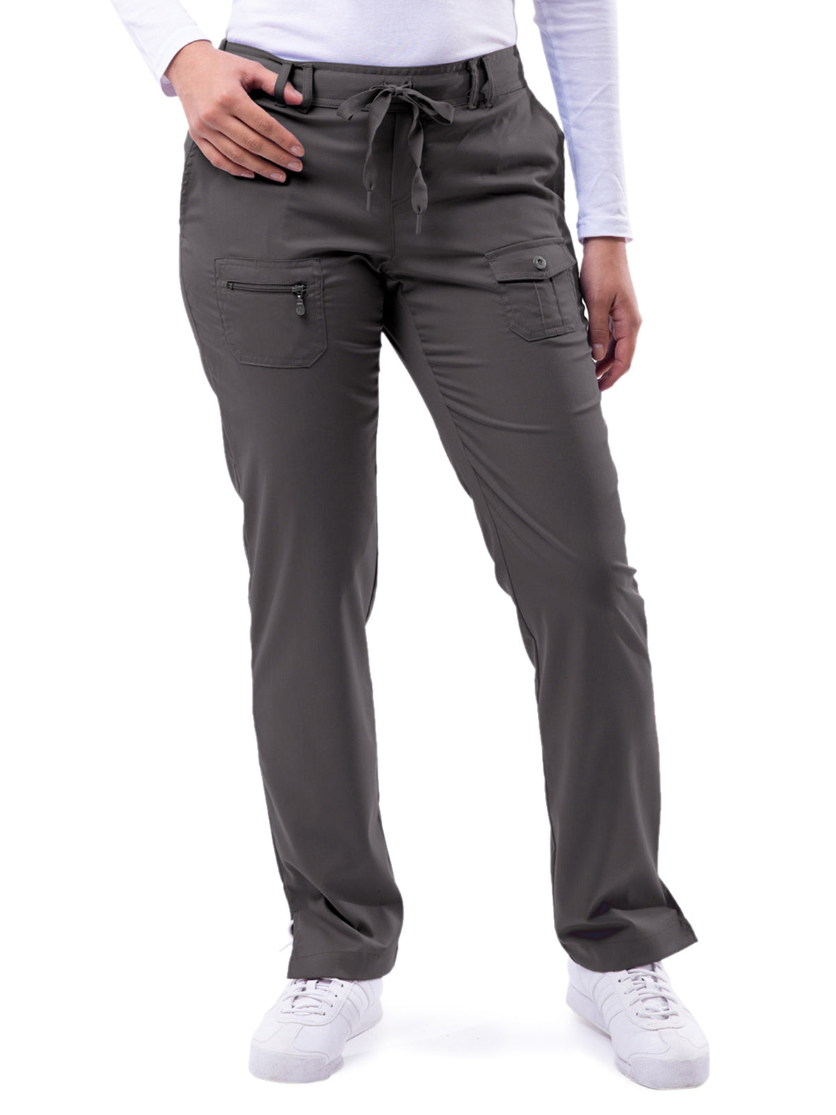 These pants are made to get you through every shift. It’s soft yet structured with enough pockets for all your work essentials. Flattering mid-rise fit that sits right below the natural waist. Features a tapered leg and a popular lay flat waistband with a stretch outer drawstring. Front and back pockets include 2 deep side slash pockets, charming cargo pockets, and zippered detailing. All-over double stitched seams and beautiful drape give these pants a luxurious finish.