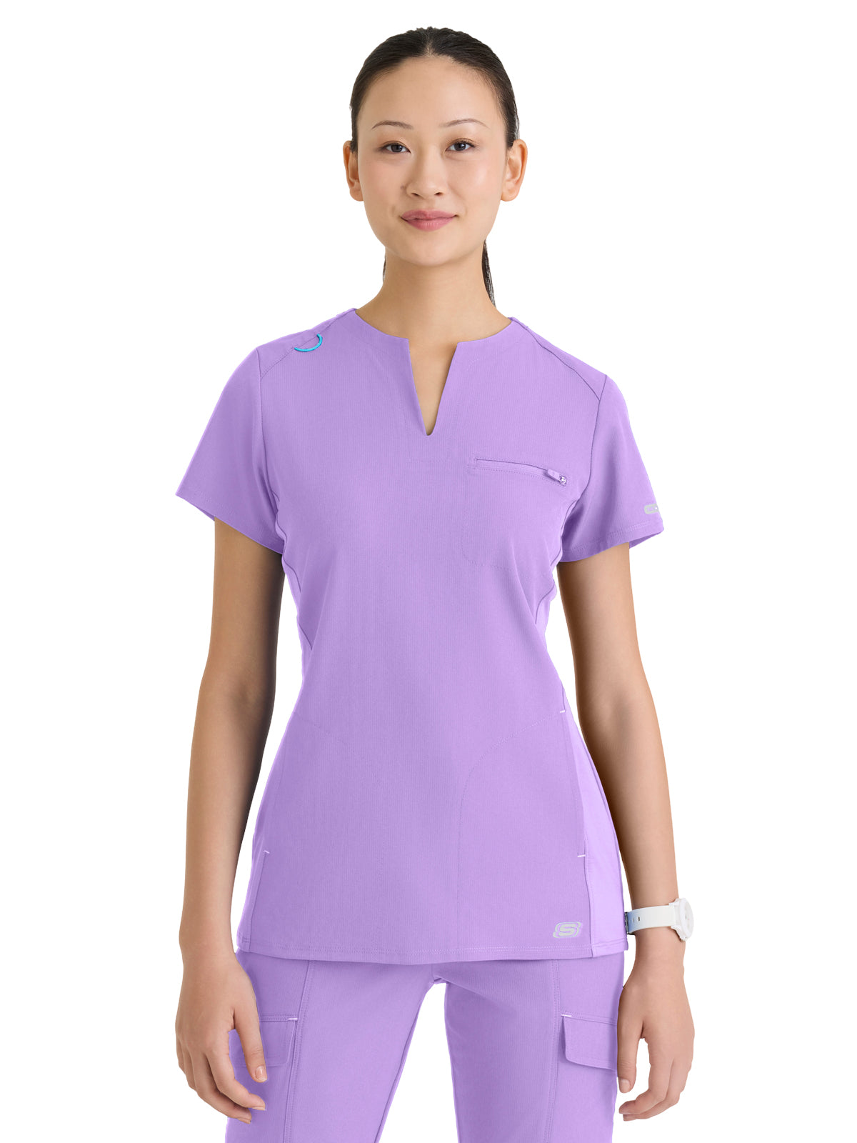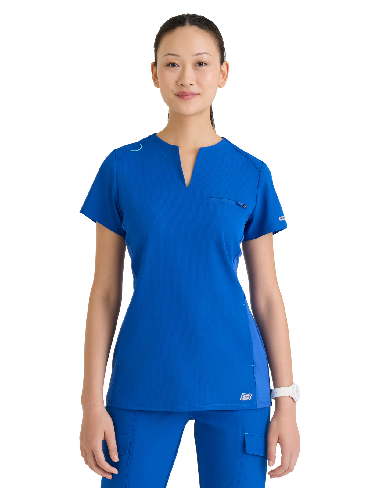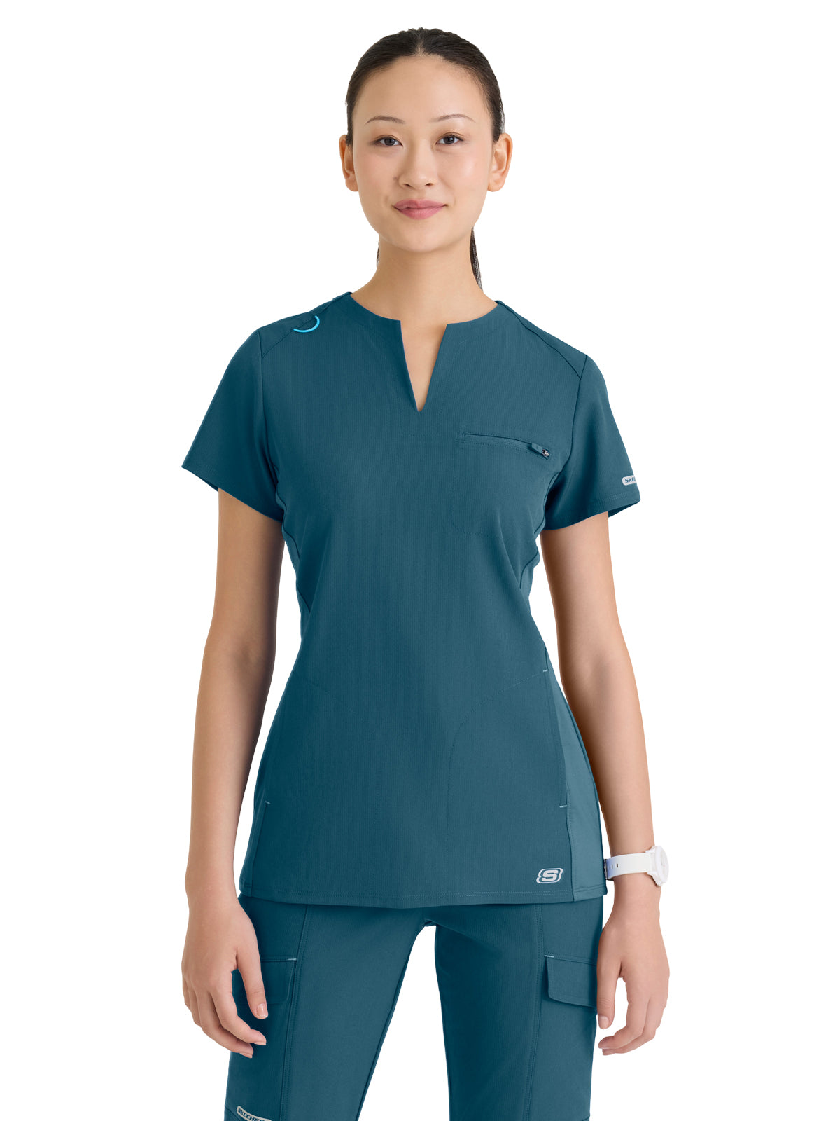 Designed for performance and polish, the Reward Scrub Top offers a slim fit with a modern high notched V-neck and sleek straight hem. It features 3 practical pockets,including a secure zip chest pocket and two discreet on-seam pockets,perfect for keeping essentials close. Side jersey insets provide extra flexibility and comfort, while a contrast badge loop on the right shoulder adds a pop of function and style. Crafted from eco-friendly fabric made with 6 recycled bottles, this top delivers 4-way stretch, moisture wicking, anti-static, and quick-shed properties for extreme all-day comfort.