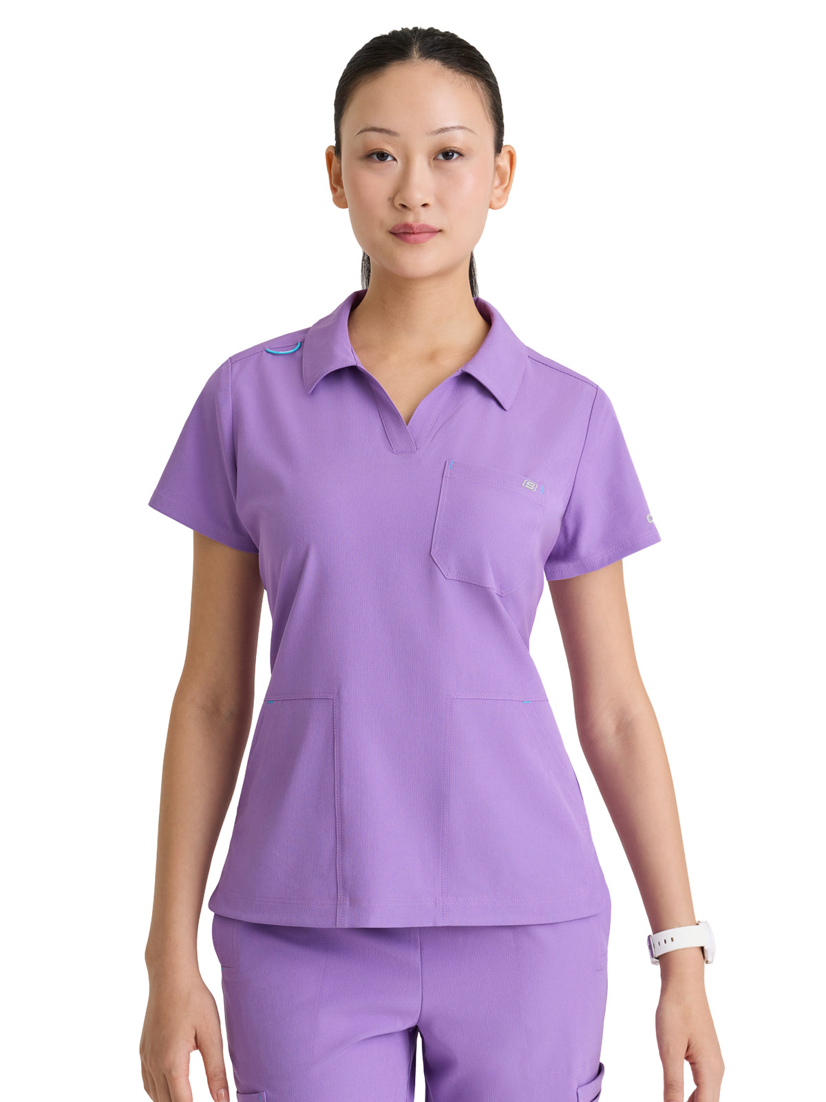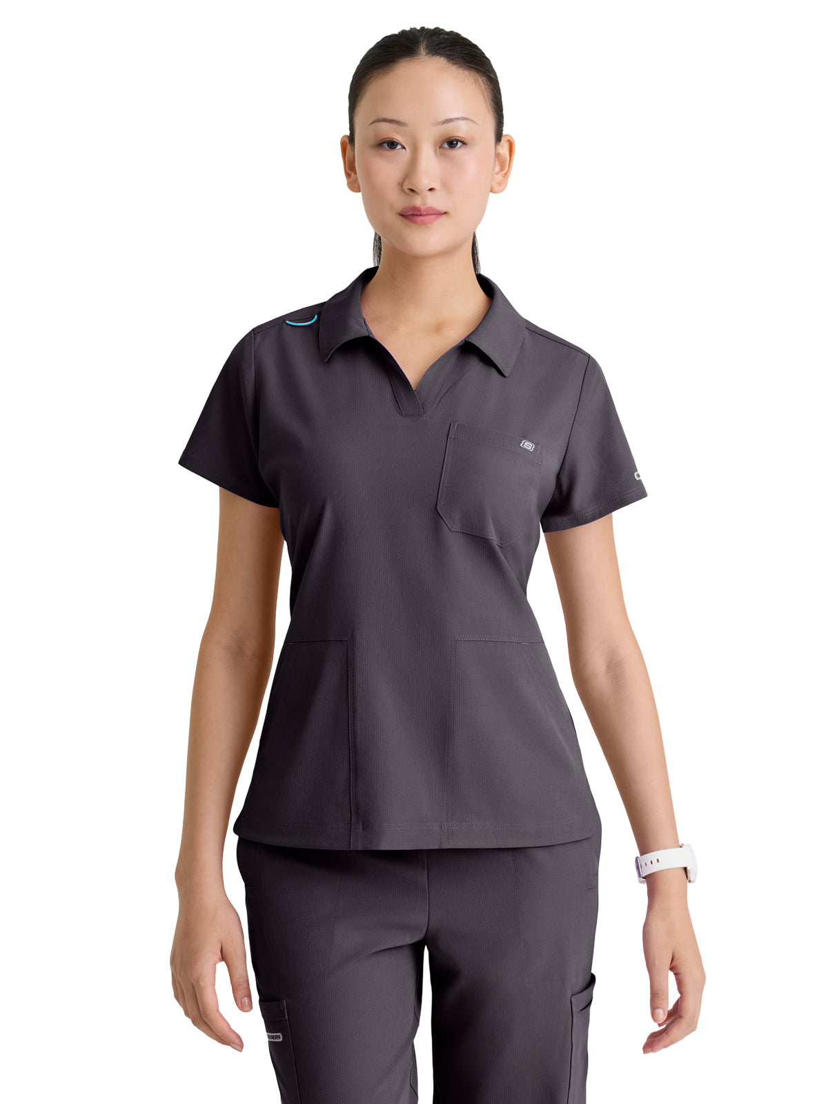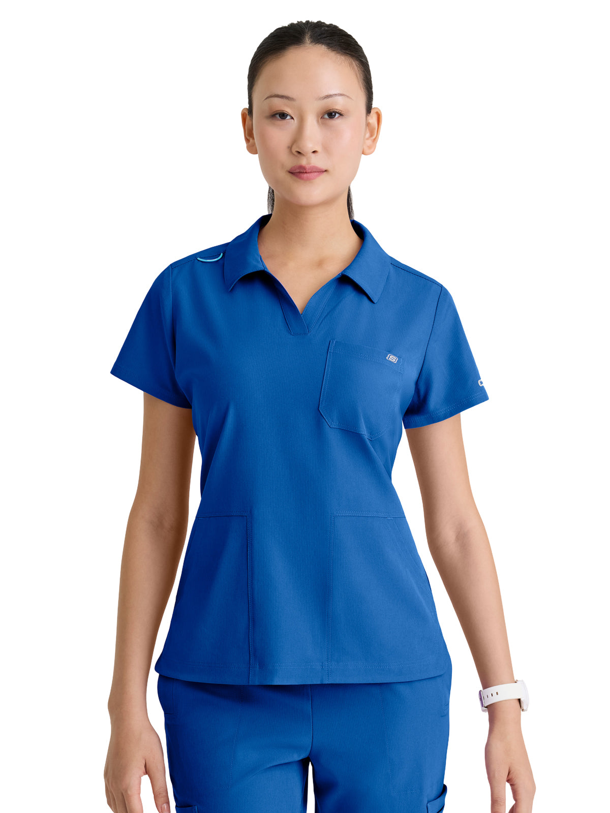 Polished and performance-ready, the Honor Scrub Top brings style and function to your everyday uniform. Designed with a slim fit and a flattering collared notch neck, it features 3 essential pockets, including a classic chest patch and two front slant pockets. The high-low curved hem adds a modern, feminine touch, while the contrast badge loop at the shoulder keeps your ID in place. Made from eco-friendly fabric crafted from 6 recycled bottles, this top delivers 4-way stretch, moisture-wicking, quick-shed, and anti-static technology for extreme comfort all shift long.